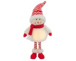 Here is a new standing lighted snowman, this stands and is lighted and battery operated with 4 hour timer, requires 3 AAA batteries that are not included, this cute snowman has fluffy soft white body and has a red knit sweater and has knit hat and scarf, and has red and white knit legs and red shoes, so cute, this snowman measures 20 inch tall by 6 inch wide, and you have to position to stand. Would accent any room standing on a table area , mantle, etc for winter and holiday season