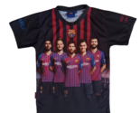 The FCB-Shirt Barcelona Rakuten in size 10 youth is a blue multicolor polyester t-shirt featuring a print of players from FC Barcelona. With a crew neck and short sleeves, this regular fit shirt is perfect for teens who are fans of the soccer team. The shirt also includes the official FC Barcelona logo, making it a must-have for young fans of the sport and team. Normal wear.