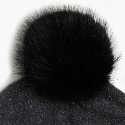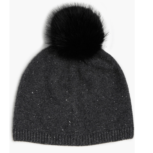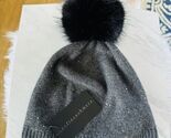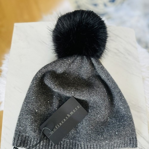 - Sofia Cashmere Sequin 100% Cashmere Beanie with Faux Fur Pompom Gray/Black, NWT