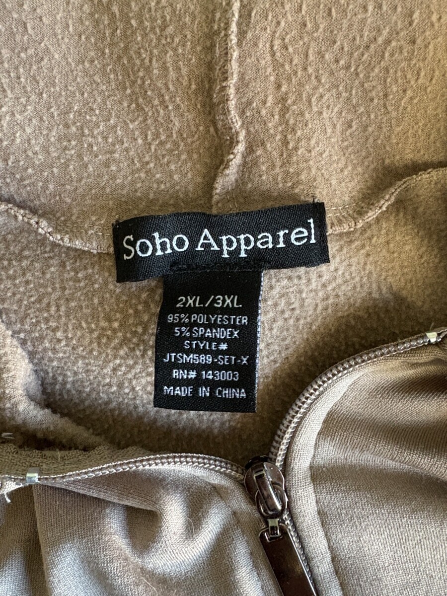 Soho Apparel Beige Zip-Up Hoodie and Jogger Set Size 2XL/3XL. Stylish beige hoodie with zip closure. Matching joggers included. Ideal for relaxed outings. The jacket armpit to armpit measures 20?. Shoulder to hem is 26?. Sleeves measure 25? from the top of the shoulder seam to hem. Pants: waistband measures 34? before stretching and stretches to 40?. Inseam is 28?. Rise is 13.5?. Total length from the top of the waistband to hem is 43?. These measurements look small for a 2X-3X. They look more like an American XL. Please go by measurements for proper fit. 95% Polyester and 5% Spandex. Hand wash. Good Used Condition - See photos for further description.
