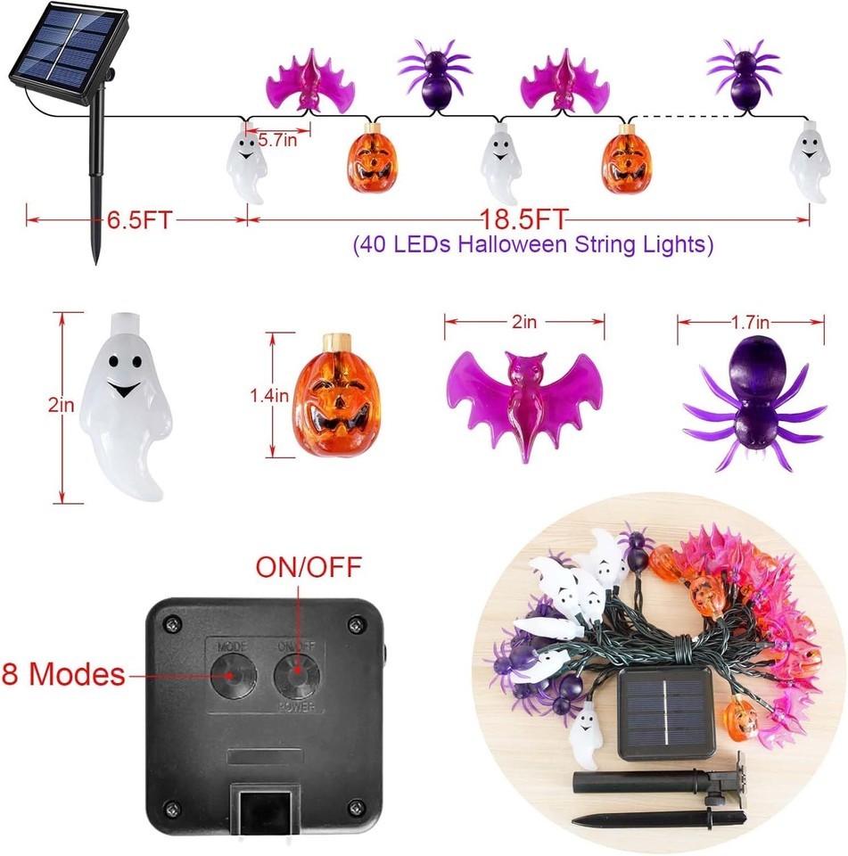 Solar Powered Halloween Lights, 40 LED, 8 Modes, Waterproof, Auto On/Off, Outdoo