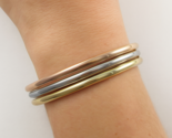 Each bangle measures 65mm on the inside diameter and a sleek 4mm wide, creating a balanced profile that feels comfortable on the wrist without being bulky. All three bangles are the exact same size, ensuring a clean, uniform look when worn together. Their smooth interior surface allows easy sliding on and off, making them ideal for daily use.