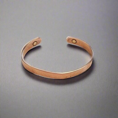 This solid copper magnetic cuff bracelet features a classic minimalist design crafted from smooth, polished copper. Each end of the cuff contains a small magnet, often worn for potential wellness or comfort benefits. The bracelet is slightly flexible, allowing for gentle adjustment to fit most wrist sizes comfortably. Its warm copper tone pairs beautifully with any outfit?perfect for everyday wear or stacking with your favorite bracelets. Whether you love the look of copper jewelry or enjoy wearing magnetic accessories, this cuff makes a stylish and timeless addition to your collection.