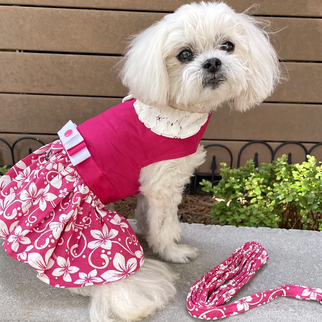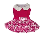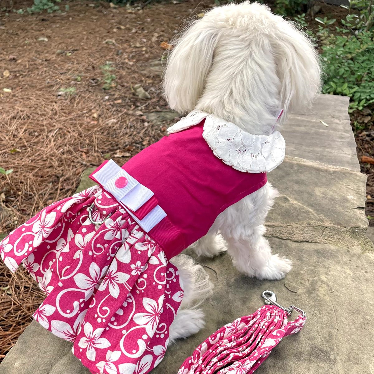 - Solid Hot Pink & Hibiscus Print Dress with Lace Collar Plus Leash Sizes XS-XL
