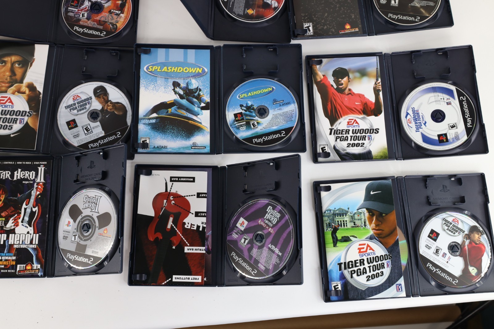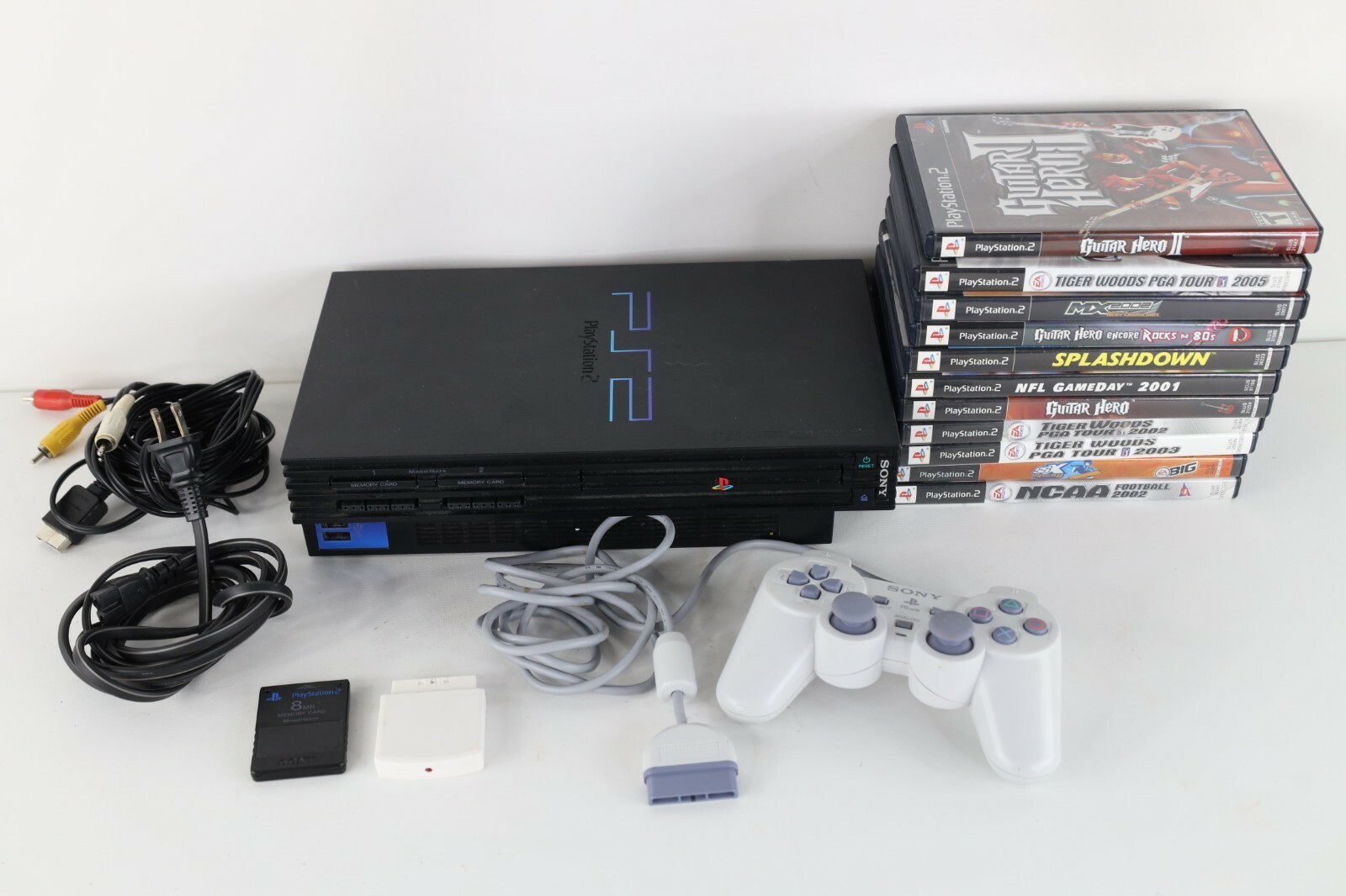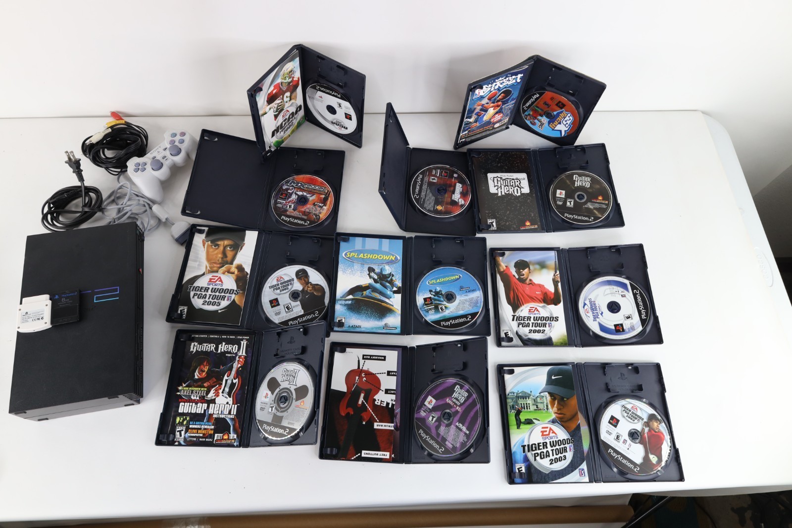 Tested and working. Has scuffs. Comes with video games, wireless adapter for guitar hero guitar and memory card. Tiger woods 2001 is in the tiger woods 2002 case