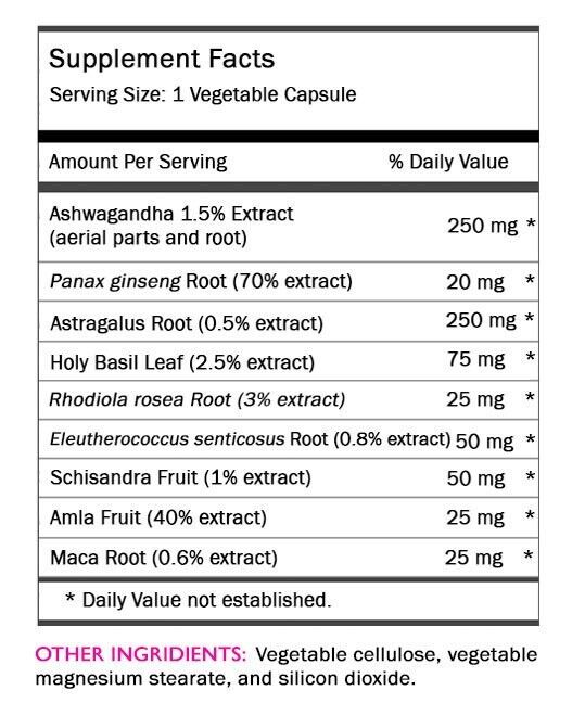 ADAPTOGEN COMPLEX: Our powerful dietary supplement designed to support a balanced internal environment and promote optimal well-being. This advanced formula combines the natural benefits of Ashwagandha, Panax ginseng Root, Astragalus Root, Holy Basil Leaf, Rhodiola rosea Root, Eleutherococcus senticosus Root, Schisandra Fruit, Amla Fruit, Maca Root with a blend of potent ingredients known for their properties.