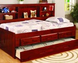 Daybeds meet Captains Beds plus a Bookcase Headboard in our Sophie bed designed to get the most functionality out of your space. These daybeds include lots of extra storage space with the bookcase headboard and 6 storage drawers. The simple, but refined design and classic merlot finish makes this bed a wonderful addition to your home. All of our furniture meets or exceeds ASTM CPSC safety standards.