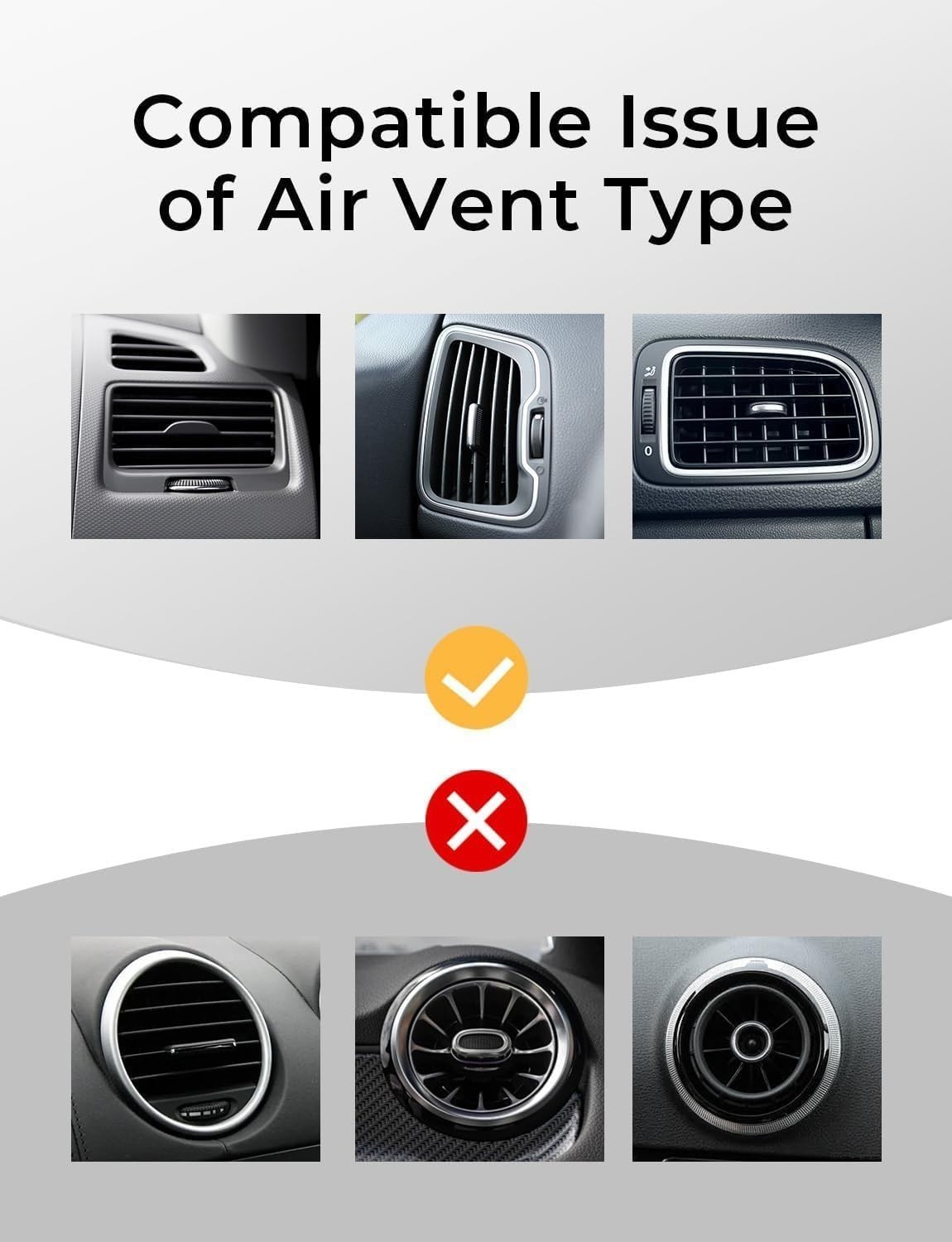 should not be placed between the case and the phone, which will cause the magnetic force to become weak and reduce the stability of the stand. Only for square air vents, not for round air vents, e.g. Mercedes-Benz full series, Kia EV6 series