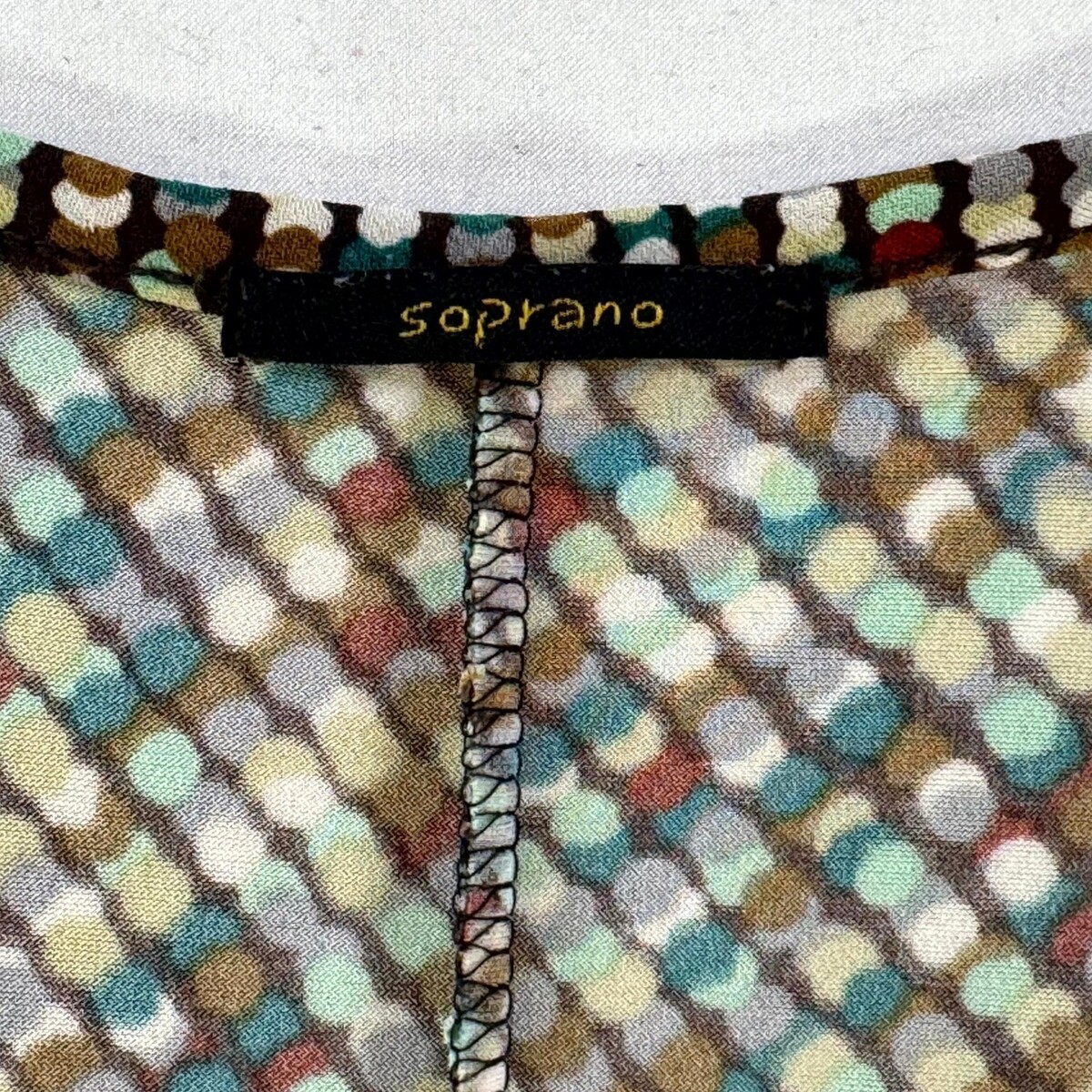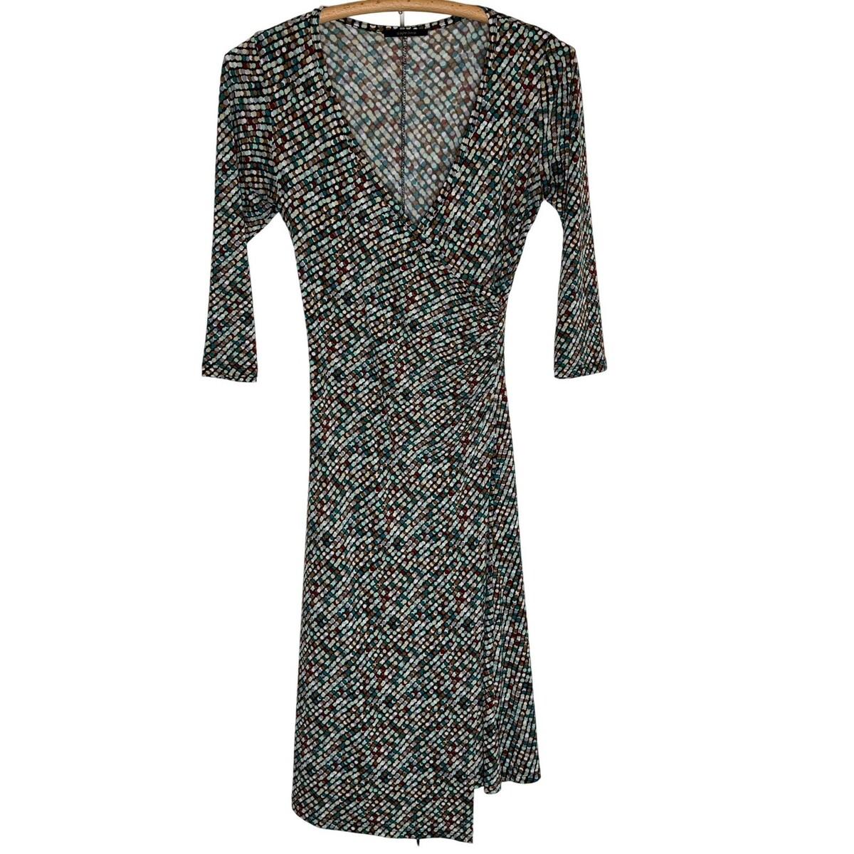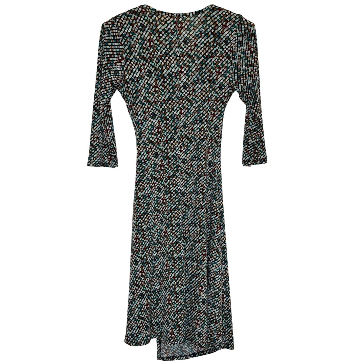 - Soprano Geometric Print Midi Dress Small 70s Retro V Neck Fit Flare 3/4 Slv USA