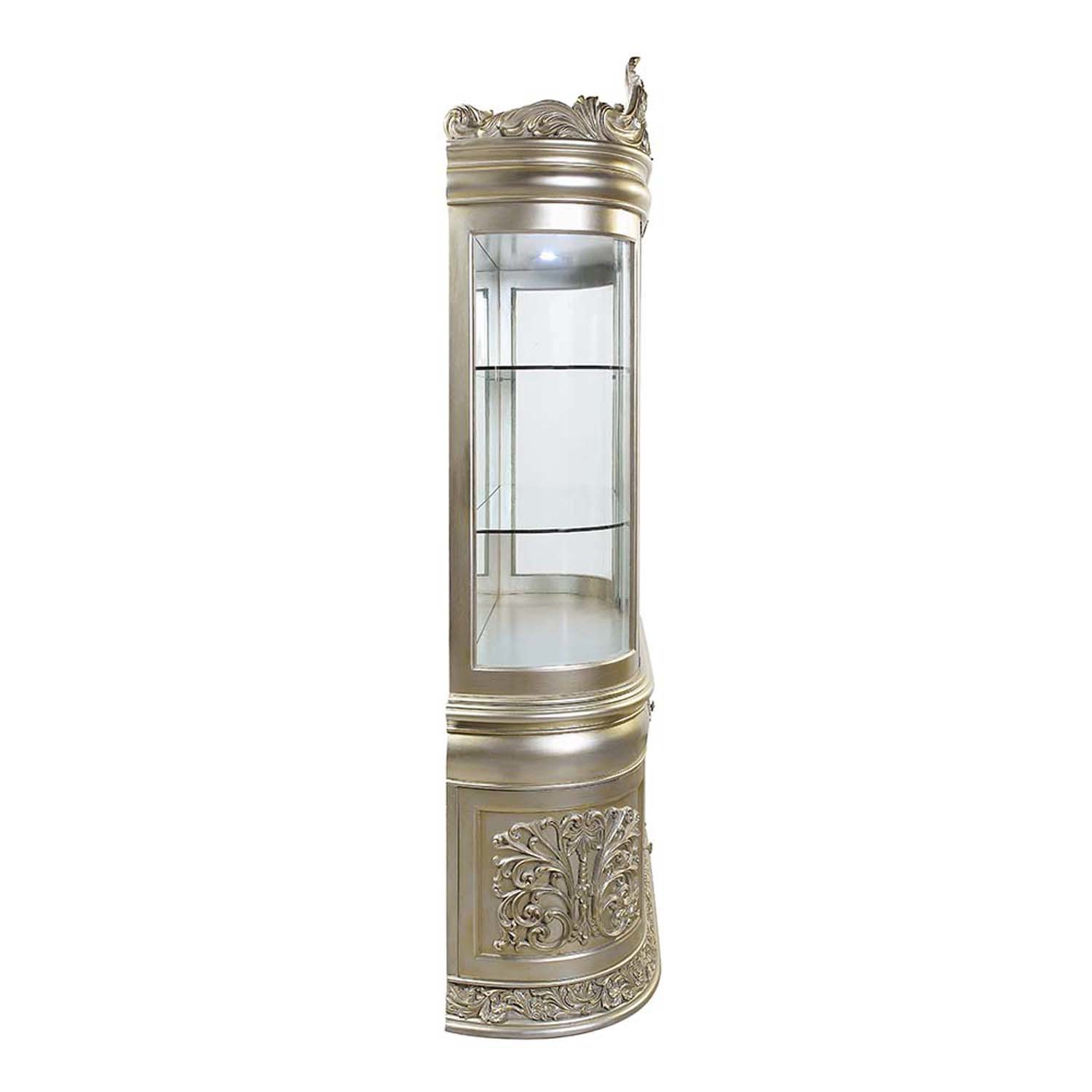 Features: Curio Cabinet Touch Light Included Fixed Shelves Oversized Crown, Raised Moldings, and Scrolled Motifs (Poly-Resin) Crafted with quality materials for lasting use Set Includes: One (1) Curio