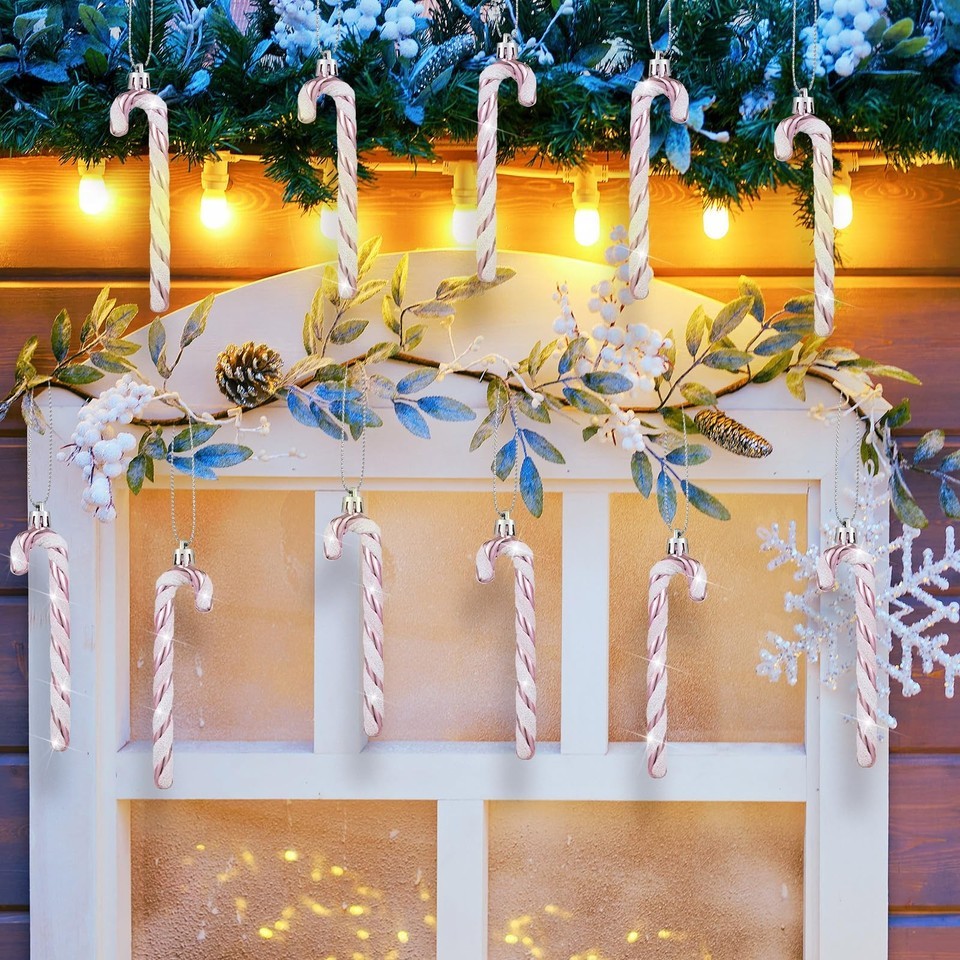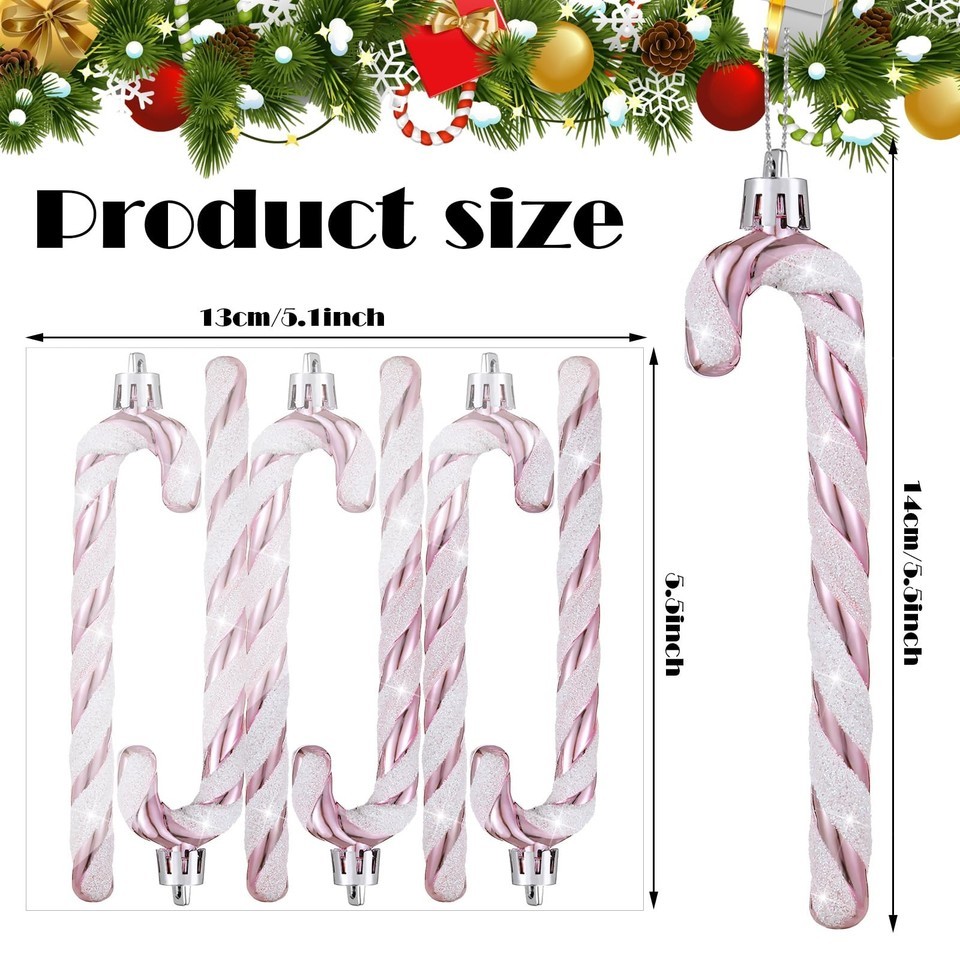 Vibrant Pink and White Design: these candy cane decorations are designed in vibrant pink and white, in the shape of a cane; The surface of the candy cane is coated with fine glitter, which shines in the light and will make your Christmas decorations more festive; The Christmas cane decorations come with a lanyard, easy for you to hang on the tree or anywhere else you want, creating a Christmas atmosphere to bring Christmas cheer to your home