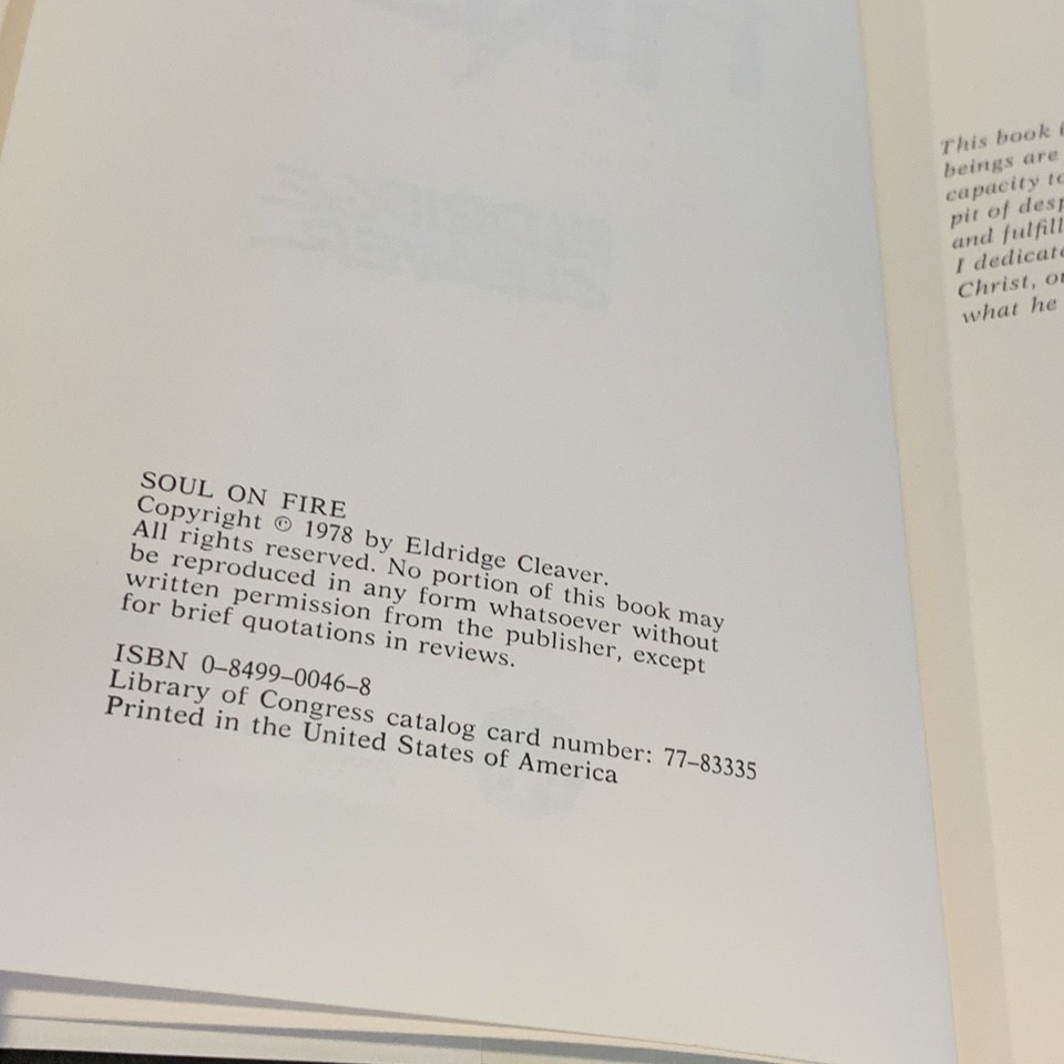 "Soul on Fire" by Eldridge Cleaver is a first edition historical nonfiction novel published in 1978 by Word Books. The book, set in the context of the Black Panther movement and civil rights, is written in English and features a dust jacket. This vintage hardcover edition is intended for an adult audience and explores the experiences and perspectives of African Americans during a tumultuous period in American history.