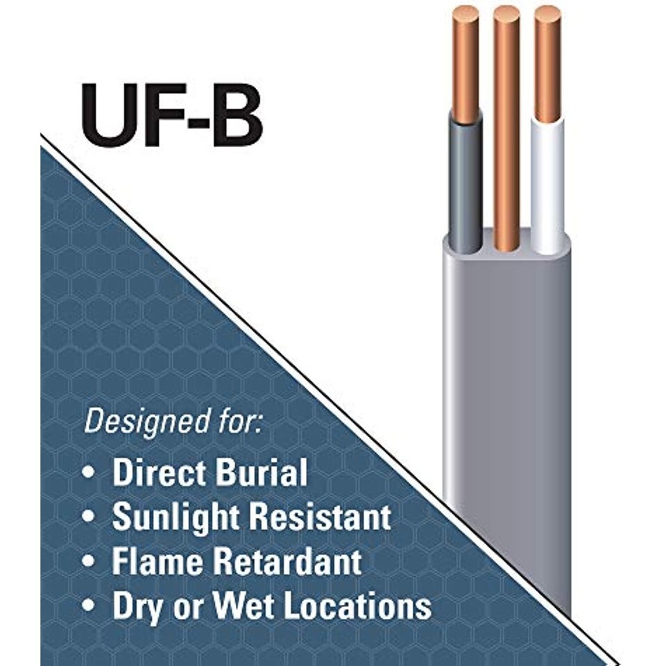 Product Description Permitted for use in direct burial applications such as exposed or concealed wiring in damp, moist, wet, dry and corrosive locations as specified by the NEC. Southwire underground feeder cable can be used in applications such as general branch wiring, new wiring, and replacement wiring. Southwire's type UF is a thermoplastic non-metallic sheathed cable. Solid copper conductor. Type TW conductor insulation color coded with thermoplastic overall jacket. UF Thermoplastic insulated 60 C wet or dry locations. UFB Thermoplastic insulated with conductors rated at 90 C. From the Manufacturer For applications of direct burial, dwellings not exceeding 3 floors above grade, underground feeder to outdoor lighting or apparatus, exposed or concealed wiring in damp, moist, wet, dry, and corrosive locations, general branch circuit wiring and new wiring or replacement wiring. Flame retardant, moisture and corrosion resistant. Sunlight resistant jacket. JC-30B Federal specification, ASTM B-3, ASTM B-8 and NY state DOS 16120-880923-2002. U.L. Listed. /2 = 2 insulated wires with bare ground. /3 = 3 insulated wires with bare ground.