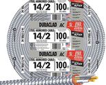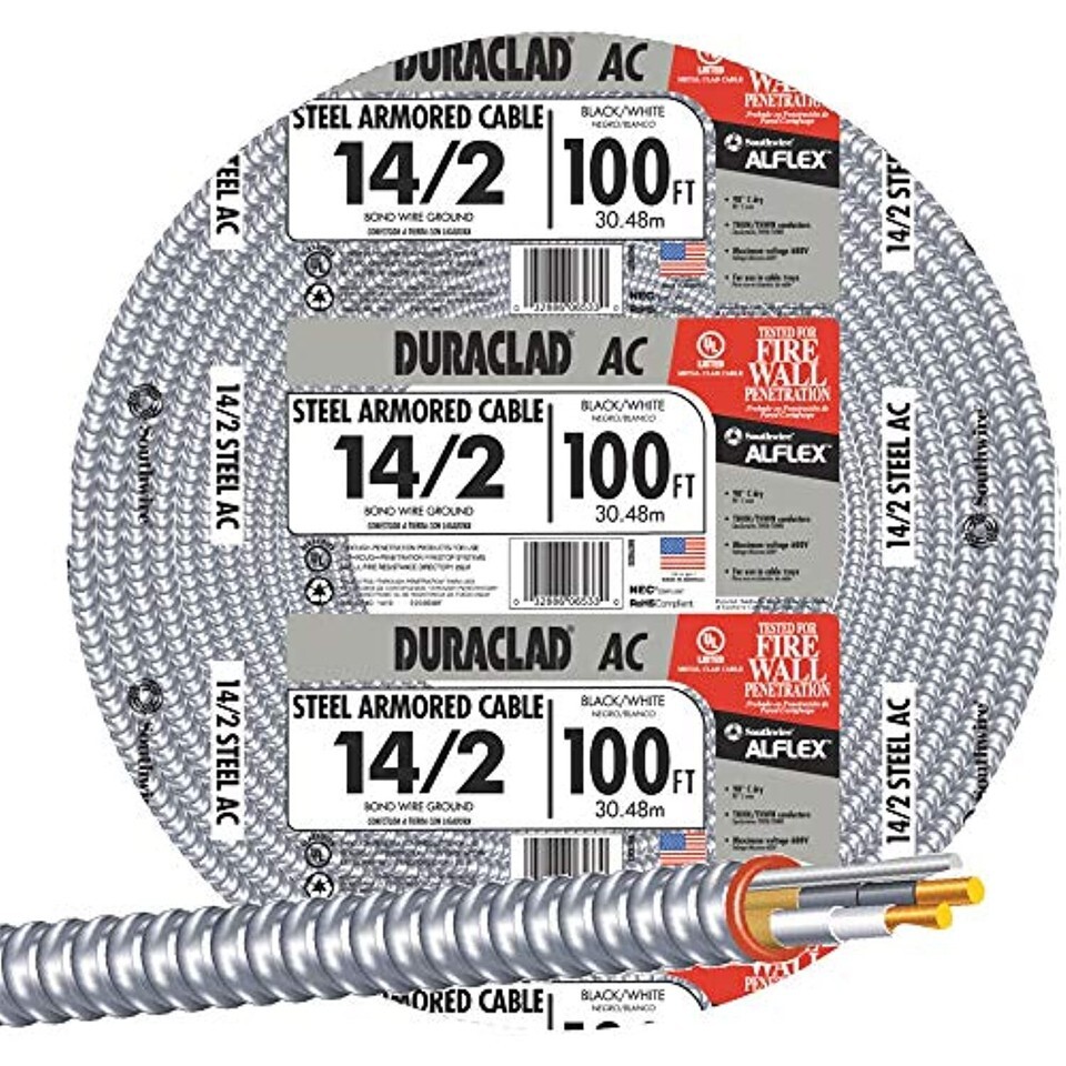 SOUTHWIRE ARMORED CABLEConstructed with soft-drawn copper, type THHN insulated conductors which are individually wrapped with a moisture-resistant, flame-retardant paper covering. Interlocking steel armor is applied over the assembly. A 16 AWG aluminum bond wire is placed inside the armor, runs longitudinally and is in intimate contact with the armor for its entire length. General applications: Dry locations only, branch, feeder, and service power distribution in commercial, industrial, institutional, and multi-residential buildings, power, lighting, control and signal circuits, concealed or exposed installations, installed in cable tray and approved raceways, environmental air-handling spaces per NEC and under raised floors for information technology equipment conductors and cables per NEC 645.5(D) 645.5(D)(2). 300.22(C), fished or embedded in plaster. Meets or exceeds the requirements of UL Standard 4 for Armored Cable, UL Standard 83, Federal Specification A-A59544 (formerly J-C-30B), and the National Electrical Code. Listed for use in UL 1, 2, and 3 hour through-penetration firestop systems.Size: 100'. 14/2 ACT Armored cable. Steel jacket. Three 14 gauge copper conductors. Aluminum bond wire ground. 90 degree. C Coil.