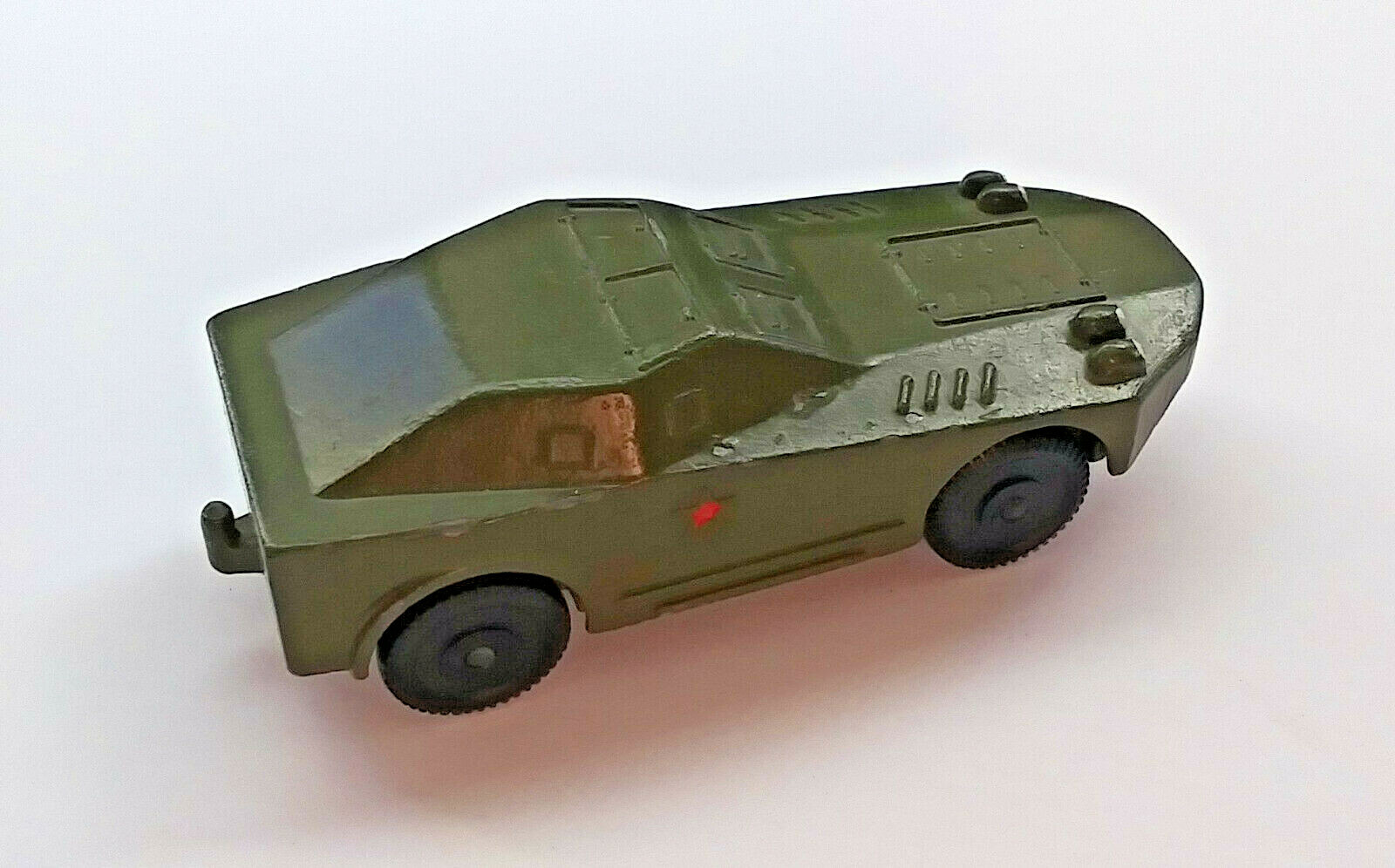 This armoured car is all metal with the exception of the wheels which are plastic. The base of the tank is also metal (there is another version that was made which had a plastic base and this one is nicer). It is 3 1/4" inches long, a bit longer if you include the trailer hitch on the rear of this armored car. It's in very good condition overall with a few scuffs in the paint on the body, and the painted headlights and red stars look good as well.