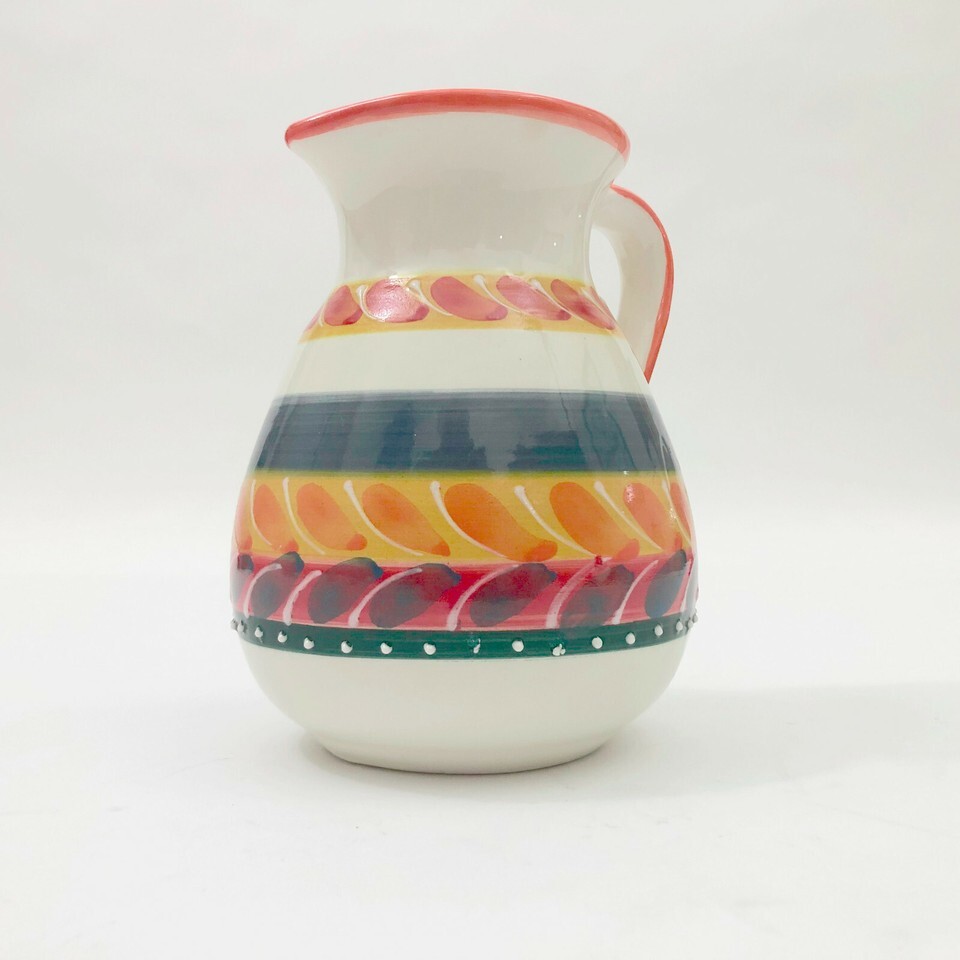 EUC, Excellent Used Condition. Beautiful vintage pitcher was handmade in Spain by HNOS Pedraza. It's colorful design will add a sense of fun a pop of color to your table. Colors are cream, orange, blue, blue/violet with a dark green border the bottom that has raised white dots on it. No chips or cracks. Use it as a pitcher or for decoration.