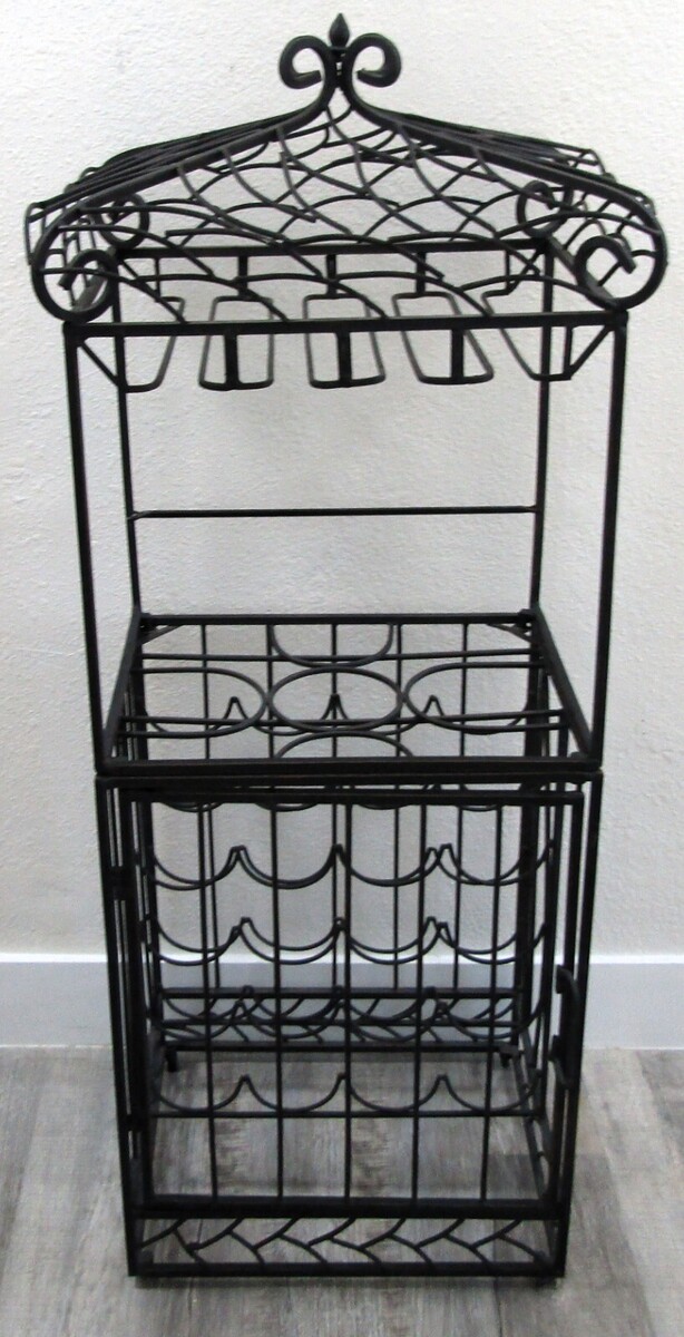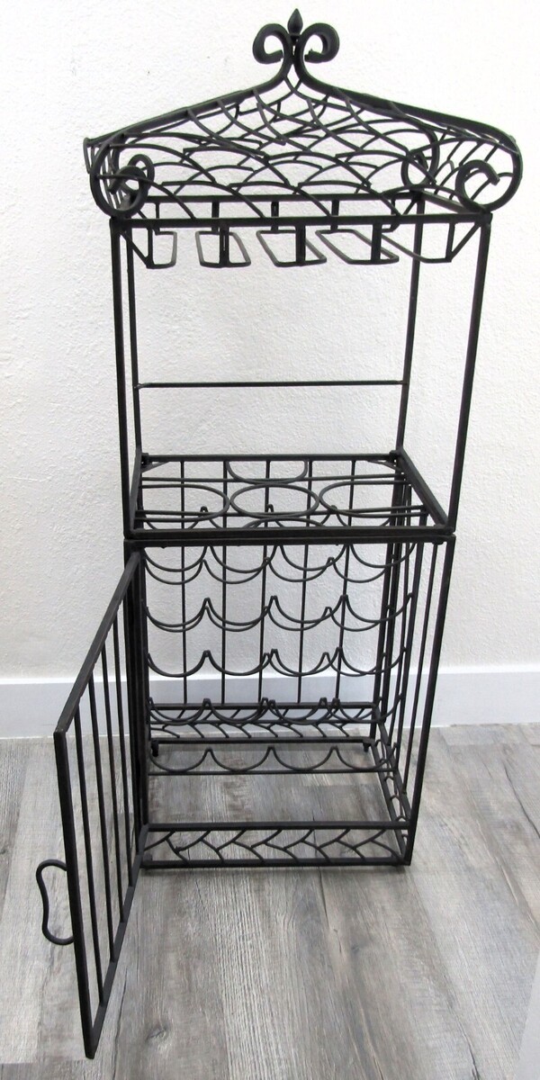 This black iron wine rack will hold 20 bottles and it has rack at the top to hold stemware. There is a flat area, above the wine holders, where you could put a shelf of glass, marble, etc. One of the four feet has been replaced. There is a handle on the door to open and close the wine bottle storage area.