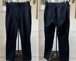 Spanx black ponte wide band flat stretchy waist pull on pants with decorative stitching for the fly and front pockets and two functioning back pockets. Tapers towards the ankle. Cotton nylon and elastane blend. Laying flat measures 13.5? straight across the waist with a 10.5? rise and 25 inch inseam