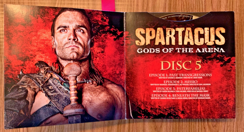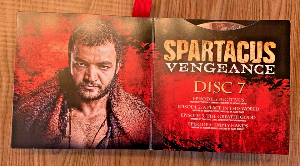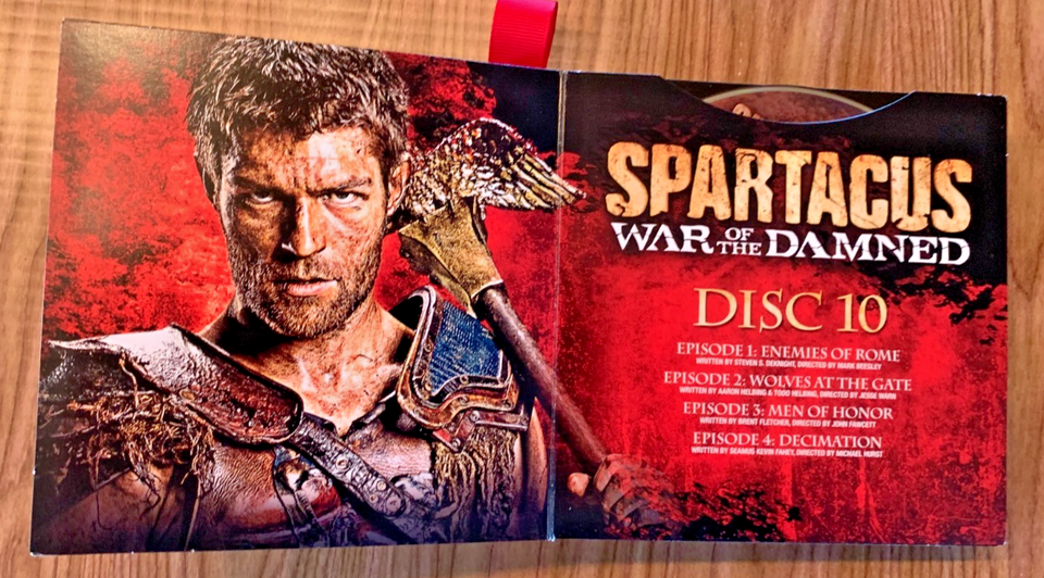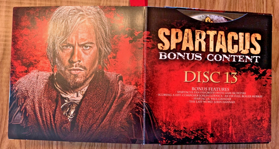 Titles include: Spartacus "Blood and Sand" 13 Episodes, Spartacus "Gods of the Arena" 6 Episodes, Spartacus "Vengeance" 10 Episodes, Spartacus "War of the Damned" 10 Episodes plus Disk 13, "Bonus Features."
