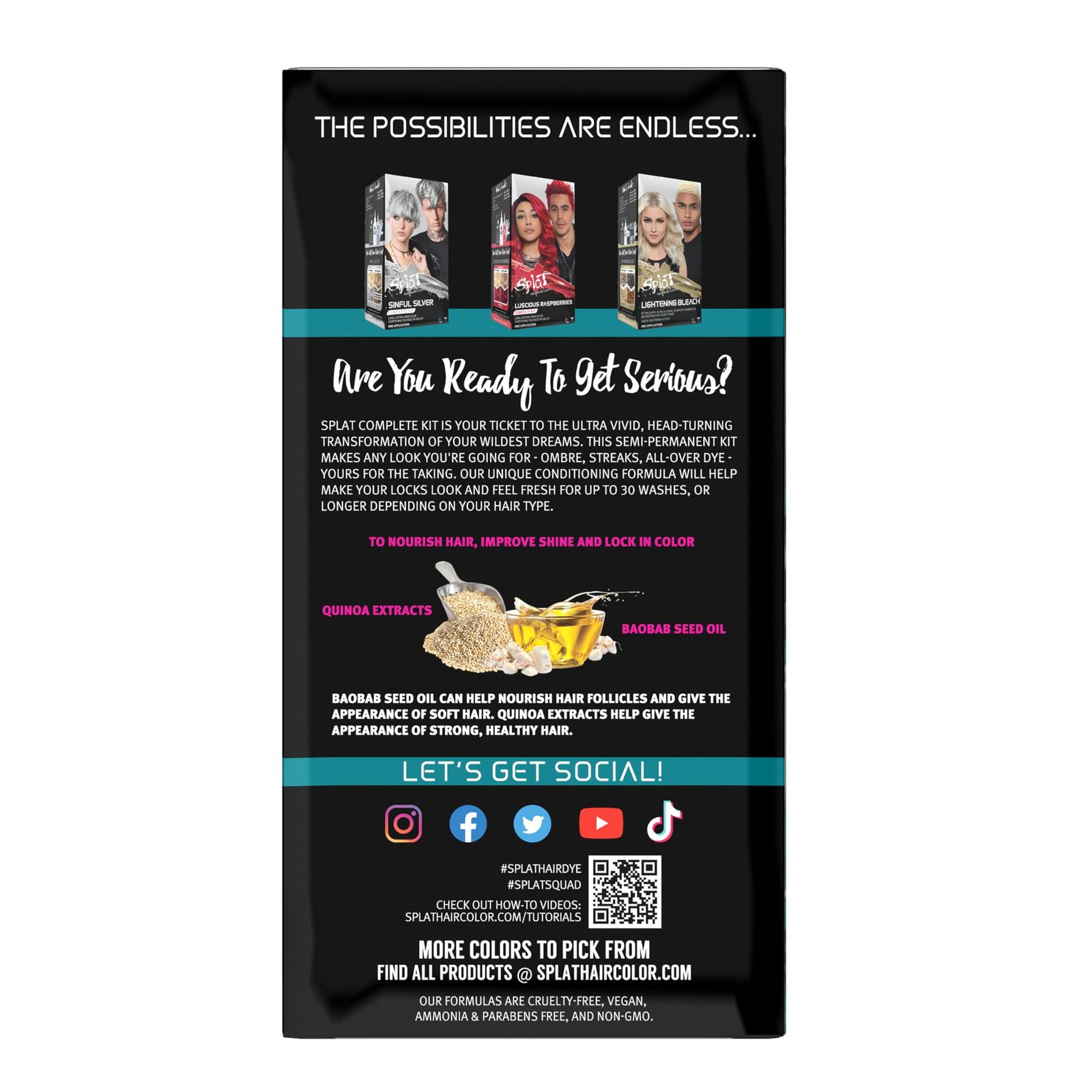 Product description: Express your creativity and individuality with a beautiful, vibrant hair color. Splat Tantalizing Teal blue bleach powder lightens hair quickly, preparing your hair for intense, bright color. Made with baobab and quinoa extracts, our semi-permanent hair dye nourishes hair, improves shine, locks in color, and provides protection against breakage. Vivid hair dye kit is ideal for all-over color, streaks, ombres, or dip dyes. Includes 3-ounce bottle of Tantalizing Teal hair dye, Splat oxide, lightening bleach powder, a pair of gloves, and an instruction sheet. For directions and cautions on how to apply the lightening bleach and hair dye, see instructions. Results will vary depending on your hair's natural color, condition, and porosity. For long or thick hair, 2 or more kits may be required.