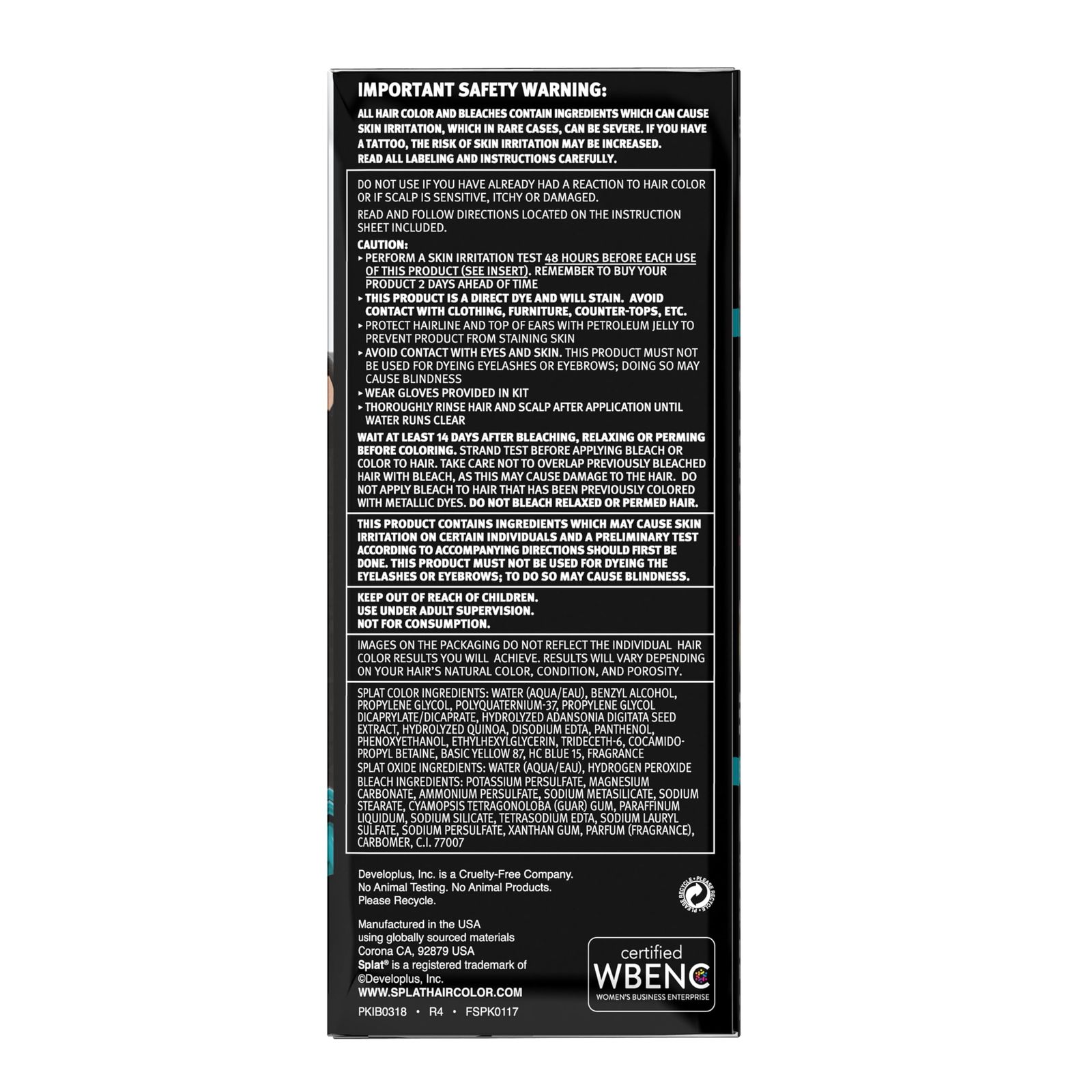 Ingredients: Splat Color Ingredients: Water (Aqua/Eau), Benzyl Alcohol, Propylene Glycol, Polyquaternium-37, Propylene Glycol Dicaprylate/Dicaprate, Hydrolyzed Adansonia Digitata Seed Extract, Hydrolyzed Quinoa, Disodium EDTA, Panthenol, Phenoxyethanol, Ethylhexylglycerin, Trideceth-6, Cocamidopropyl Betaine, Basic Yellow 87, Hc Blue 15, Fragrance Splat Oxide Ingredients: Water (Aqua/Eau), Hydrogen Peroxide Bleach Ingredients: Potassium Persulfate, Magnesium Carbonate, Ammonium Persulfate, Sodium Metasilicate, Sodium Stearate, Cyamopsis Tetragonoloba (Guar) Gum, Paraffinum Liquidum, Sodium Silicate, Tetrasodium EDTA, Sodium Lauryl Sulfate, Sodium Persulfate, Xanthan Gum, Parfum (Fragrance), Carbomer, C,I, 77007.