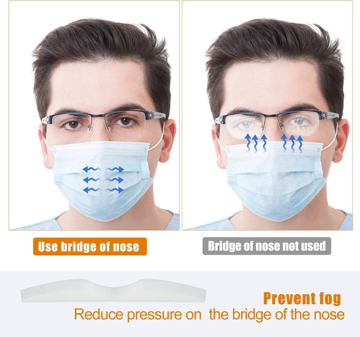 : for people who wear glasses.foam nose pads creates a barrier,that fills the gap between the cheek and nose and redirects the air outward towards the side of the mask,This prevents eyeglasses from fogging.Please note that the package only contains 50pcs of anti fog nose bridge, Mask is not included