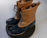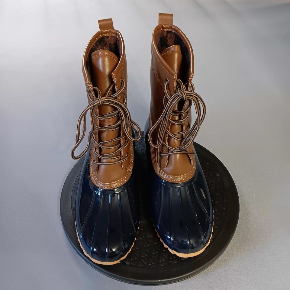 The Sporto Ariel Duck Boot in navy blue and brown is a stylish and functional choice for women in US shoe size 9M. This waterproof rain boot features a round toe shape, lace-up closure, and a low platform height for comfort. Made with a combination of leather and rubber, this boot is perfect for winter, fall, and spring seasons. The ankle shaft style and faux fur lining add extra warmth and style, making it a versatile option for activewear, casual outings, or workwear. Excellent condition, see pictures.