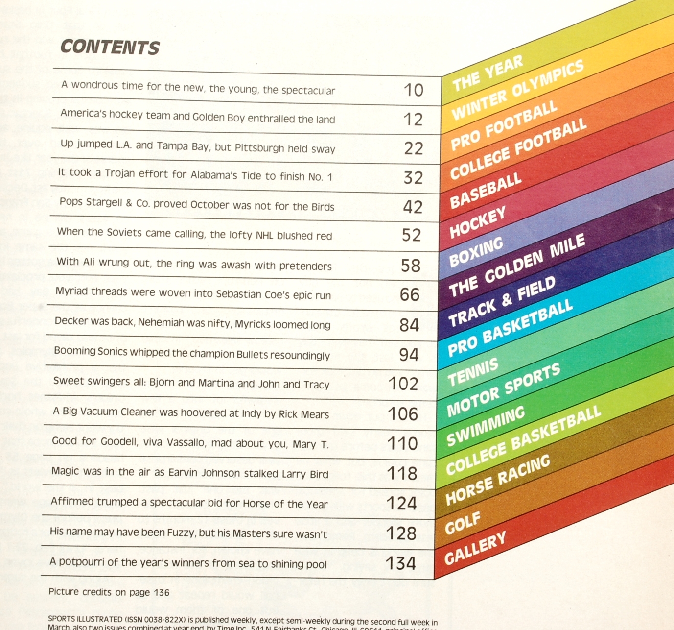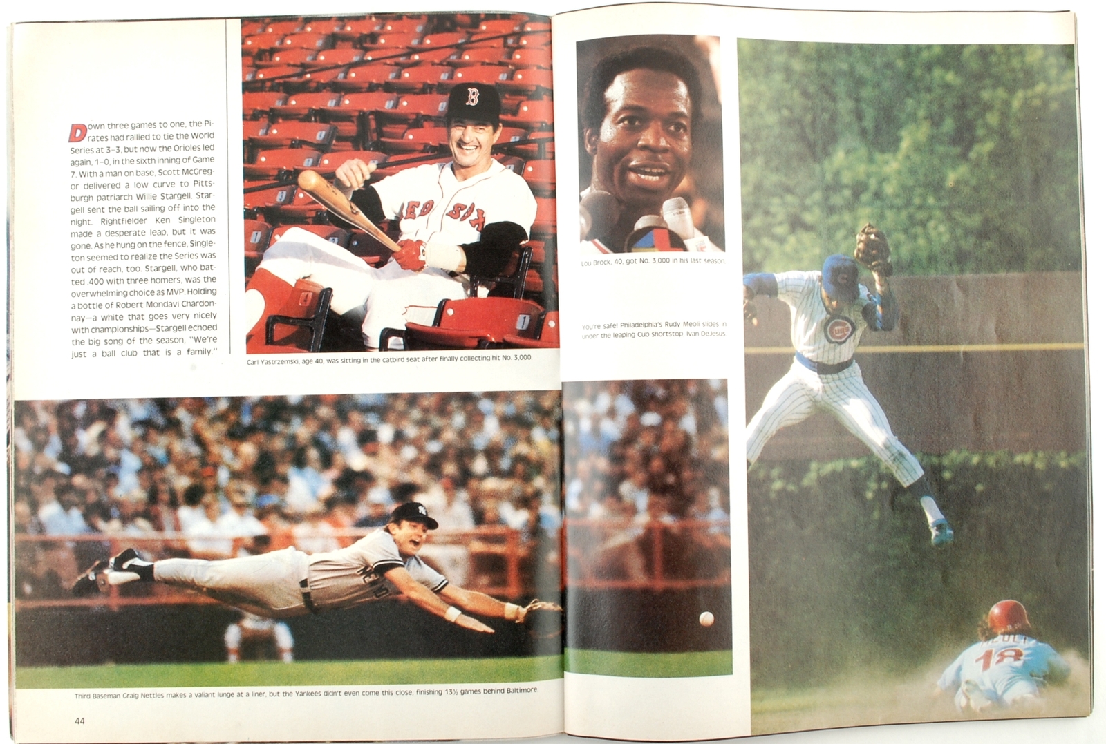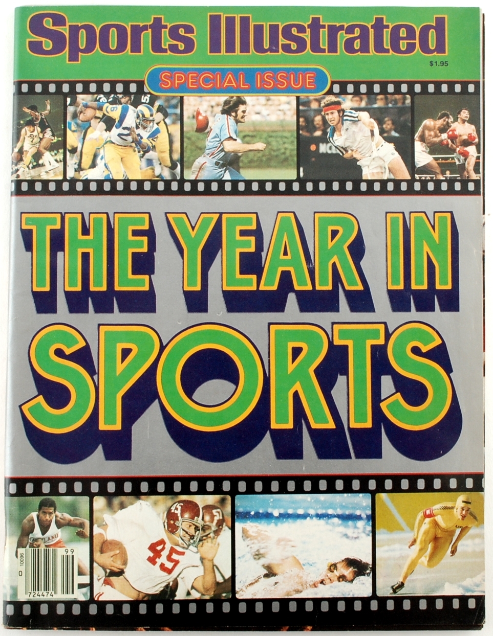 Sports Illustrated, The Year in Sports, Special Issue, March 13, 1980, Volume 52, No.11. The USA Olympic hockey team success at Lake Placid was one of many stories that year. Affirmed was Horse of the Year. Larry Bird and Magic Johnson continued their rivalry. Carl Yastrzemski and Lou Brock got their 3000th hits. This magazine is very clean with no loose pages, tears or writing and is in very good to excellent condition. I am not a collector, however, and have no experience in grading magazines. Sold as is.