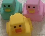 Square Chick Bath Toy Enjoy floating it in the bath. This cute chick toy has a matte, smooth texture and makes a sound when pressed. The Poo-Poo mascot is approximately 4cm tall, 5cm wide, and 5cm deep at its deepest point. This is a set of three. As it was used as a toy, there are some minor stains.