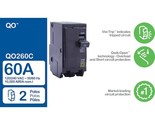 QO circuit breaker 60 Amp, 2 pole plug on, ground fault circuit interrupter. QWIK-GARD overload and short circuit protection. Suitable for feeding 240 VAC and 208 VAC 2 wire loads only. Does not contain load neutral connection. 10,000 Amp interrupting rating maximum. For use in QO load centers or NQOD panel boards.