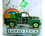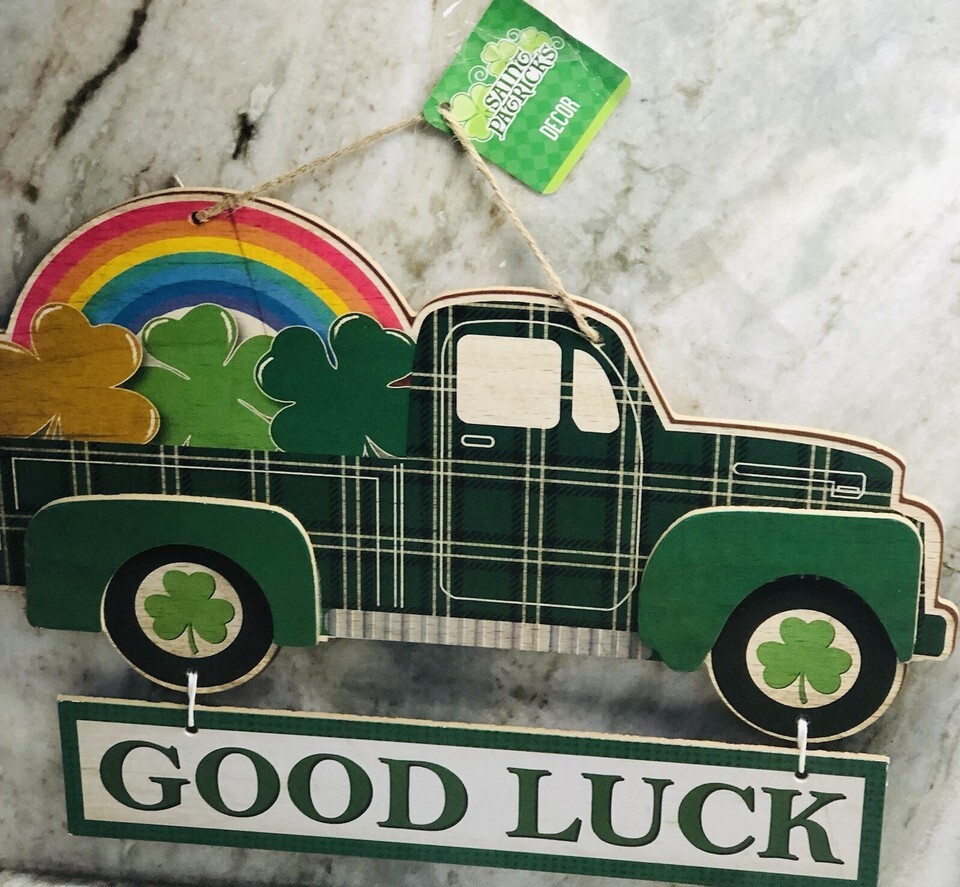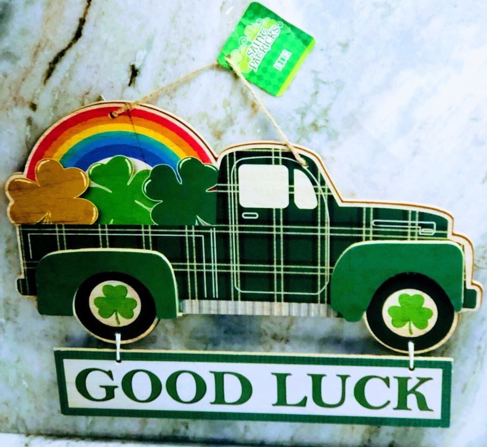 St Patrick's Day Green Truck Shamrocks Hanging Sign Irish Wall Decor NEW.