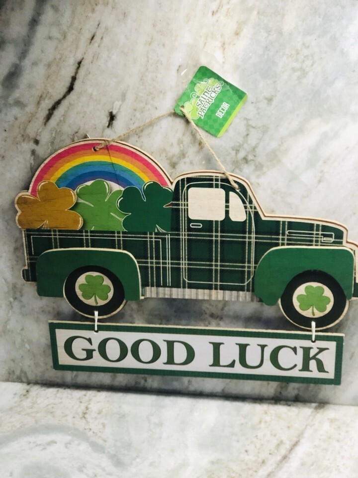 - St Patrick's Day Green Truck Shamrocks Hanging Sign Irish Wall Decor NEW