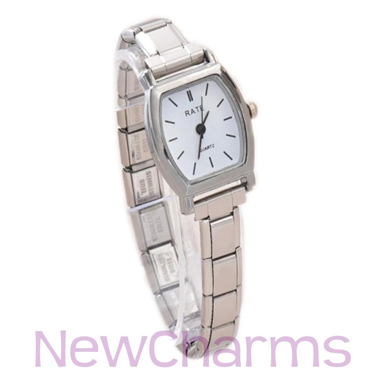 These are our great new stainless steel Italian Charms watches. They include the bracelet and a new battery and are ready to go! Whether you are buying for yourself or as a gift they will be a great fit! (Especially since you can add or remove charms as needed to customize the size and design of the bracelet.)