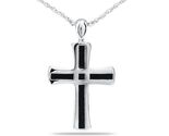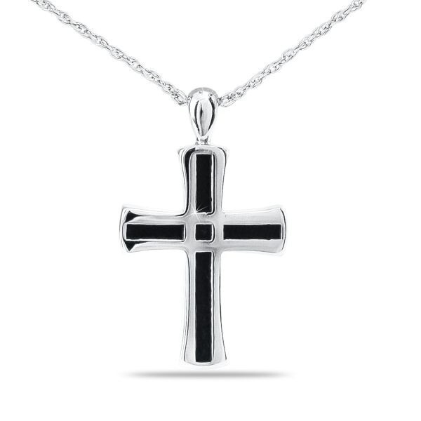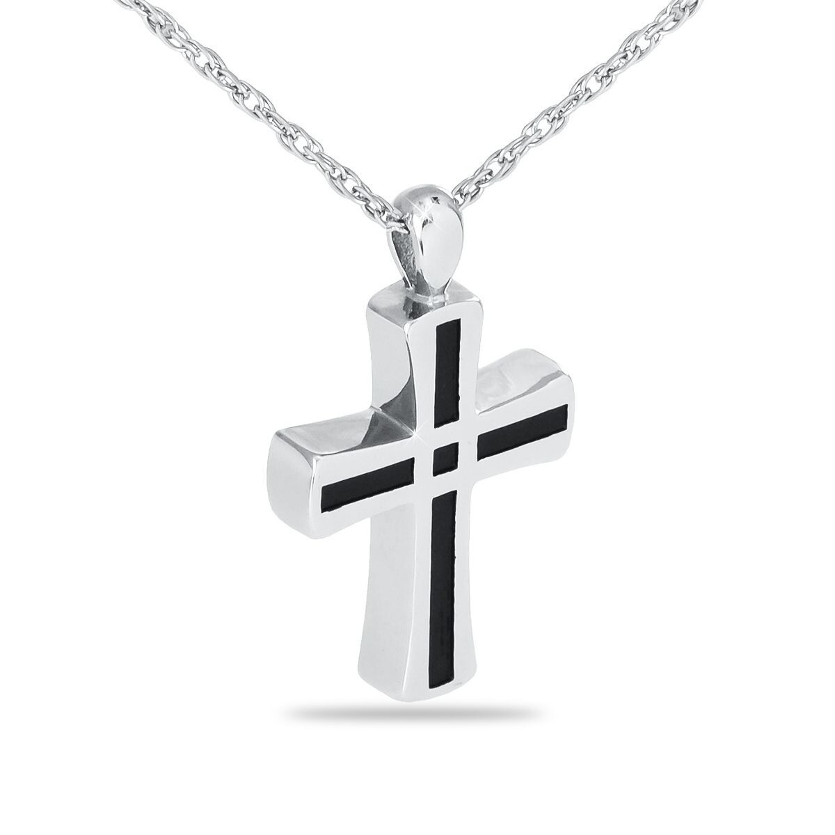 A striking stainless steel cross with black inlay, designed to hold a small portion of ashes and symbolize enduring faith.