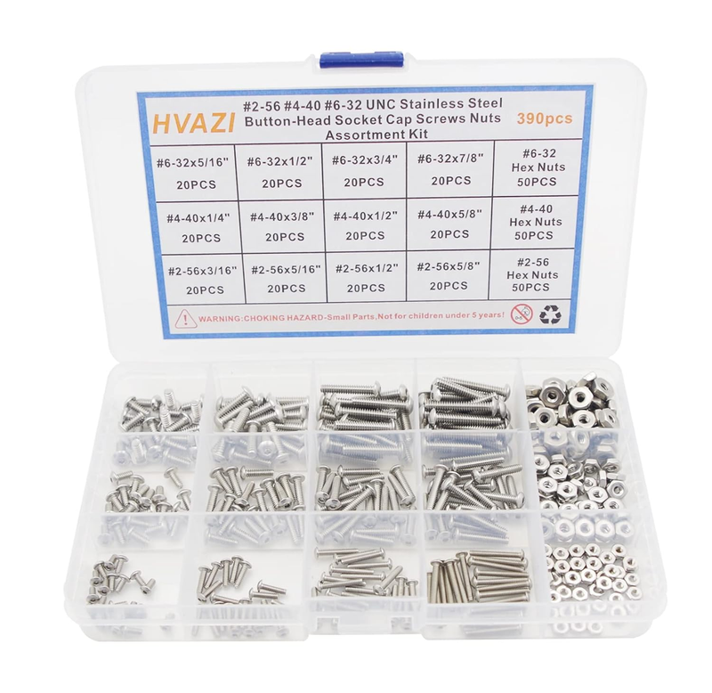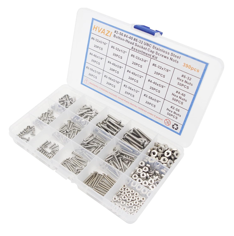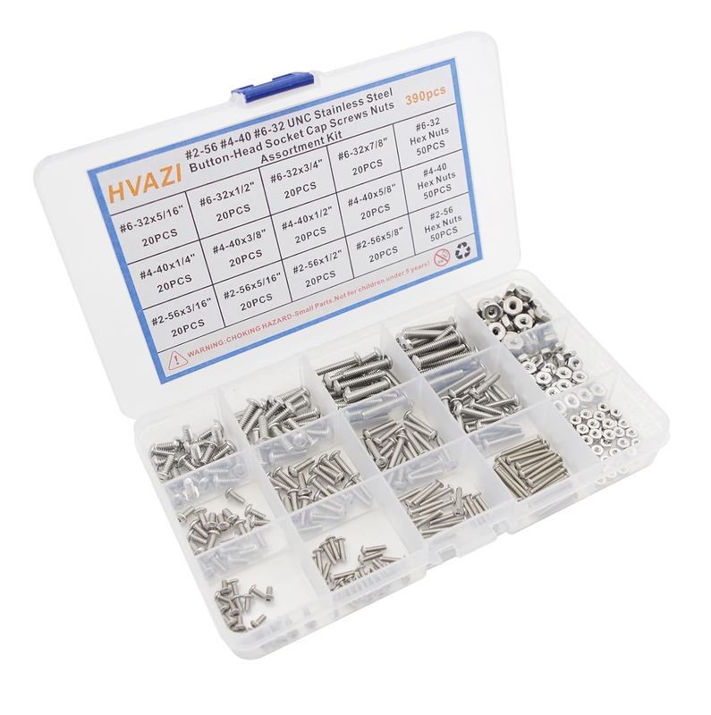 This 390-piece UNC Stainless Steel Assortment Kit provides the most commonly used #2-56, #4-40, and #6-32 button-head socket cap screws with matching hex nuts. Perfect for professionals, hobbyists, and DIY users, this kit covers a wide range of fastening needs.