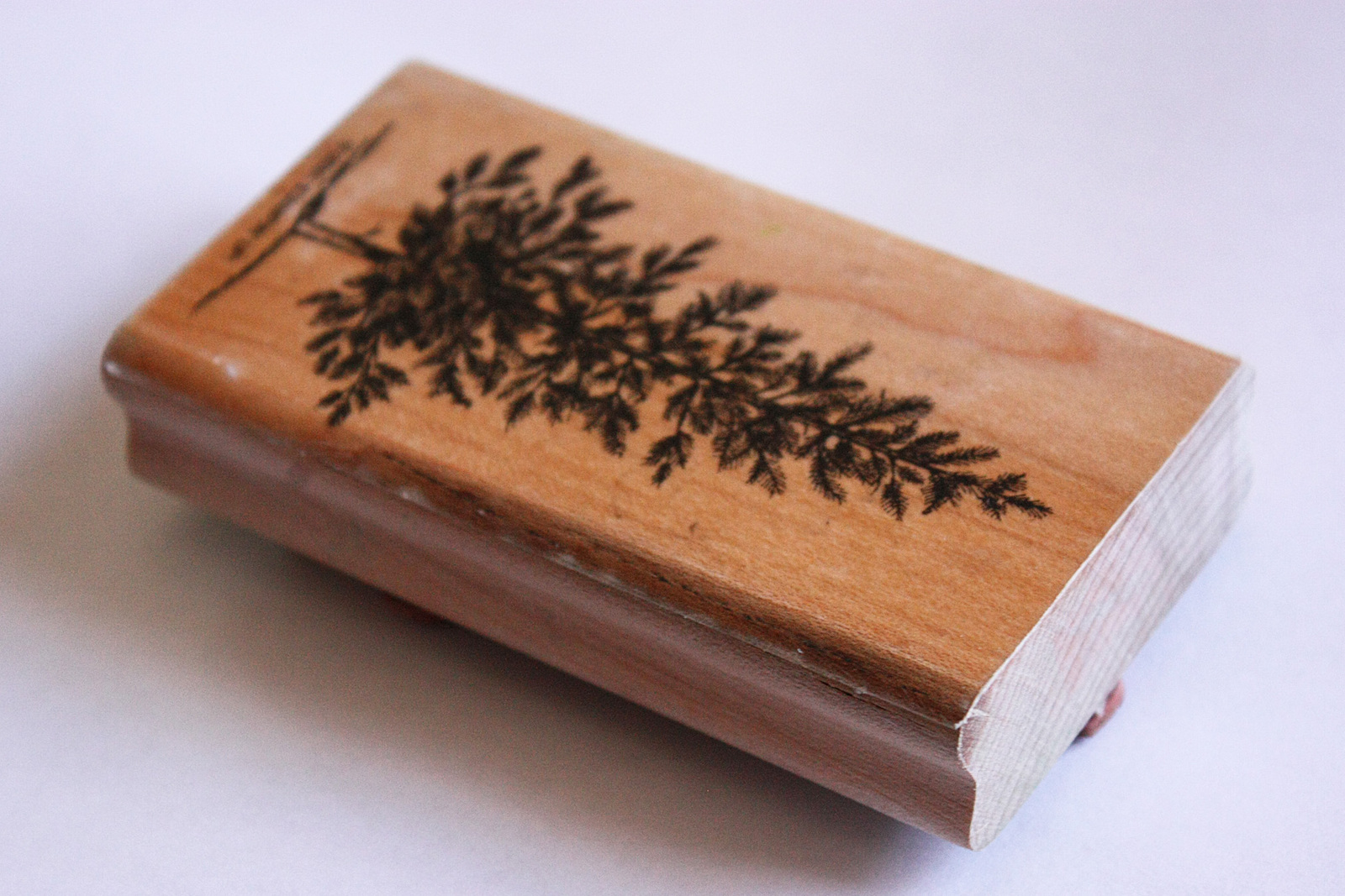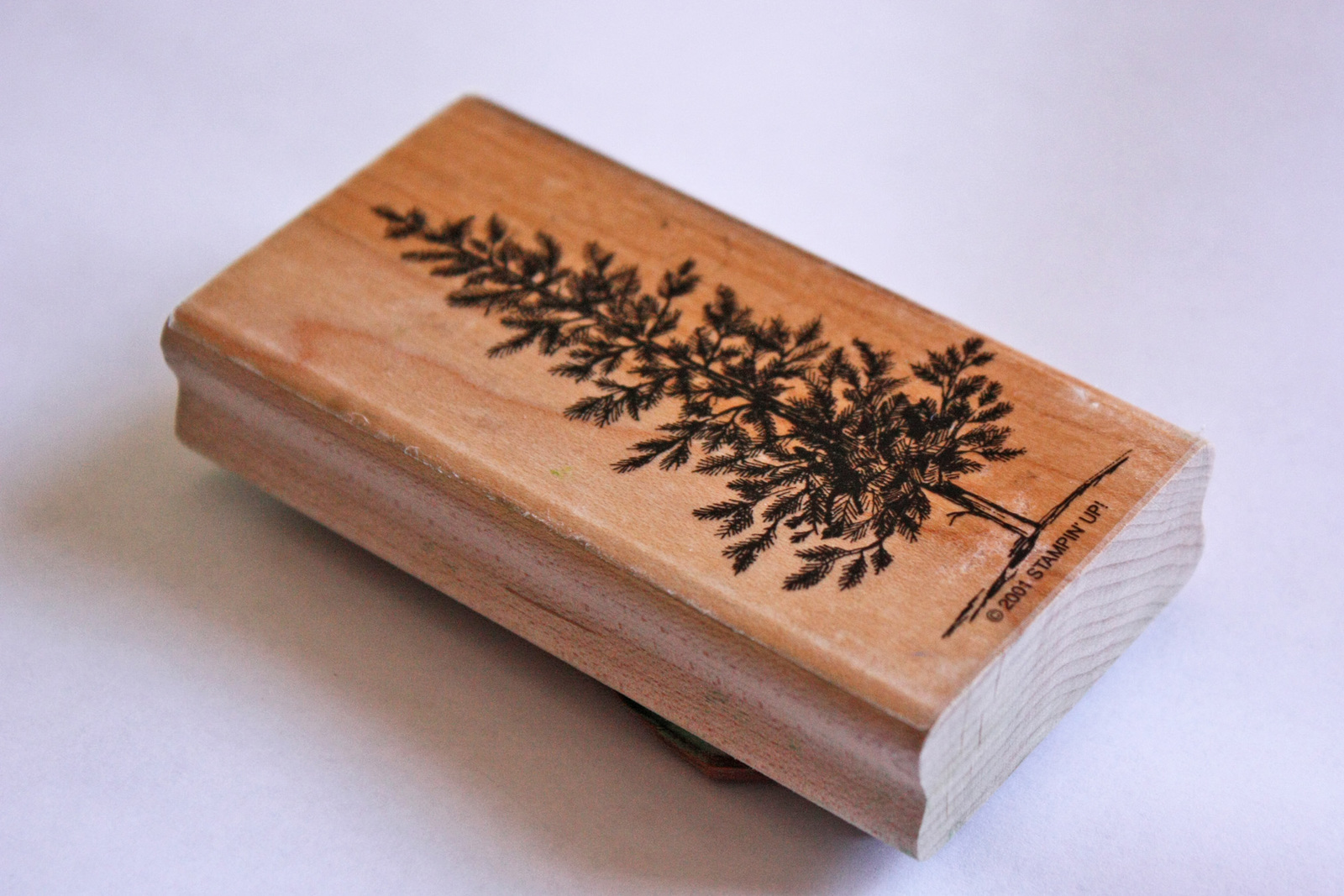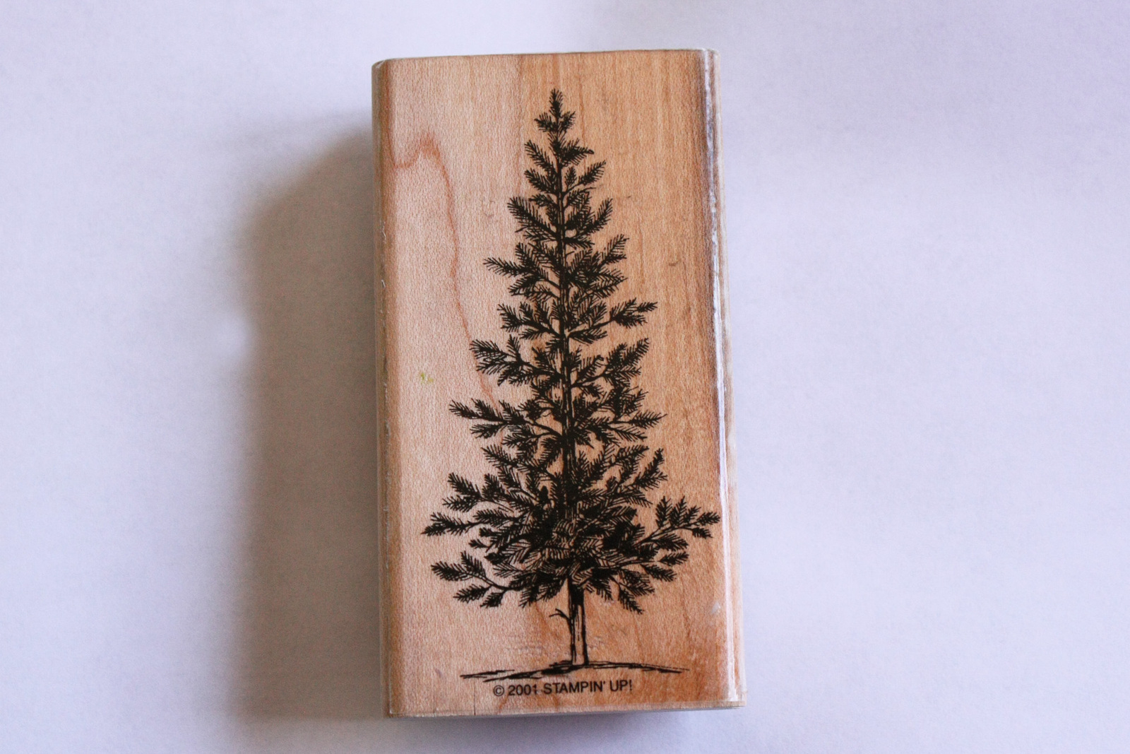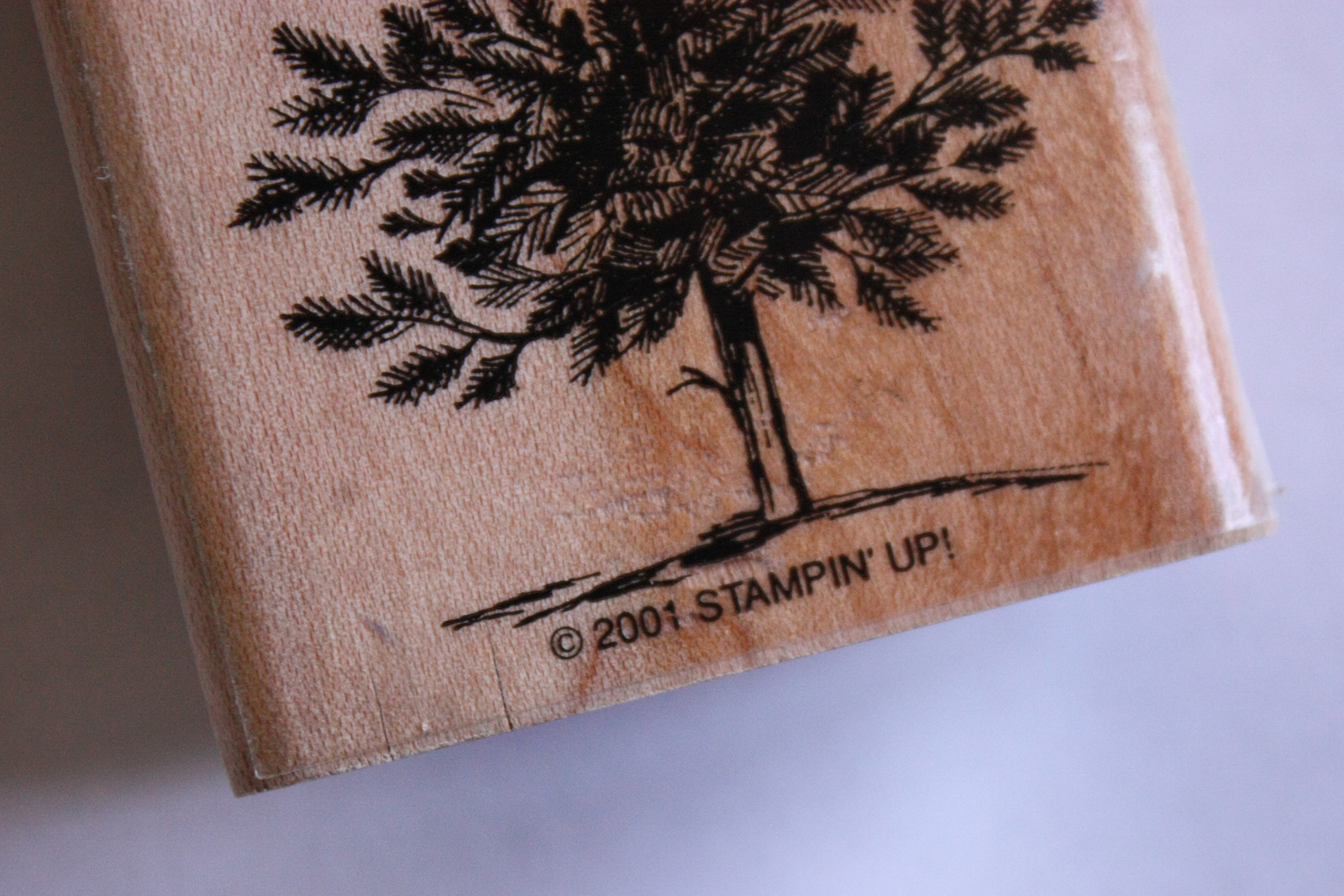 This is a 2001 Stampin Up! mounted rubber stamp of an evergreen tree that is in excellent condition. The stamp is 3.75" x 2" with a stamp area of 3.25" x 1.75". There is no ink residue on the rubber stamp and minimal staining on the wood. See pictures for condition.