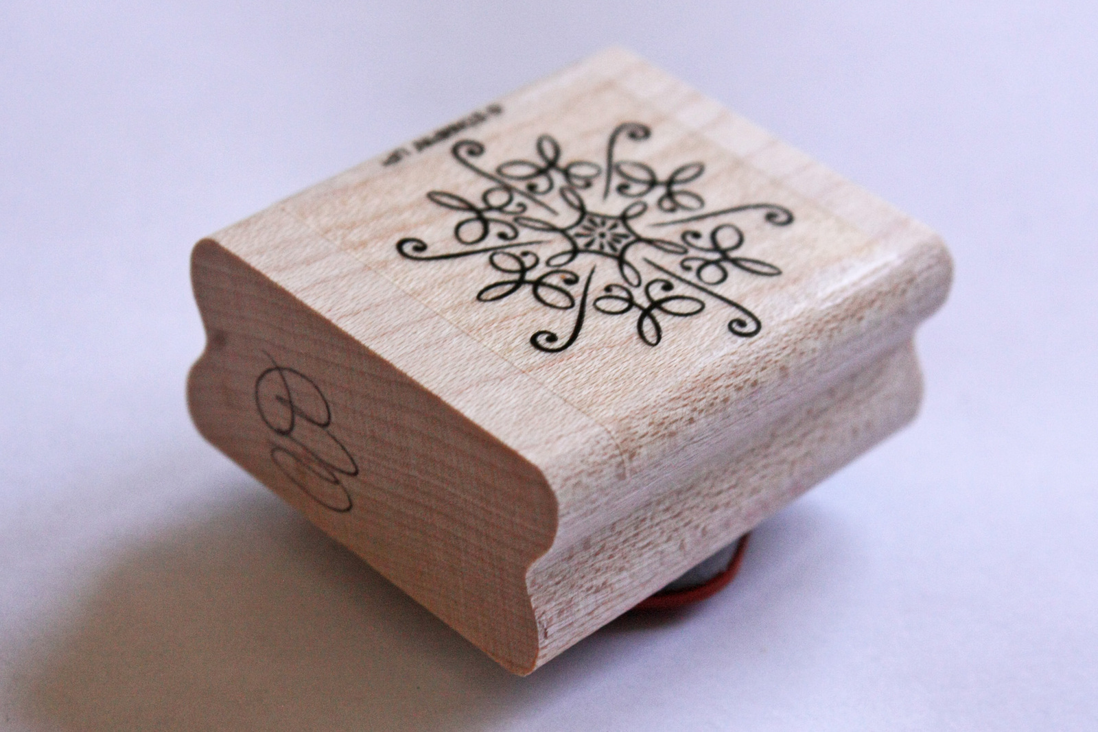 This is a Stampin Up! swirly snowflake mounted rubber stamp that is in like new condition. There is no ink on the rubber but there is some pen marks on the side of the wood. The stamp is 1.75" x 1.5" with a 1 1/8" x 1.25" stamp area.