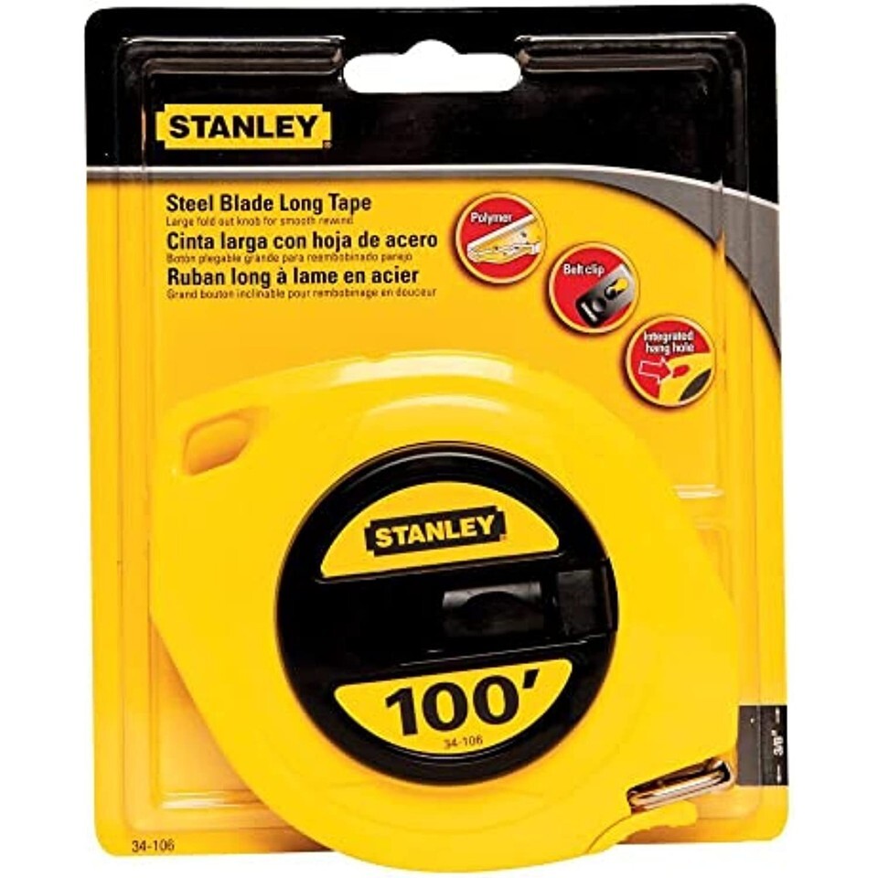 Product Description Tape Measures, Long Tape Measure, SAE, Blade Length 50 ft, Blade Width 3/8 in, Graduation Type in /ft, Graduations 1/8 In., Blade Material Steel, Tip Style Folding Hook, True-Zero(TM), Case Type Closed, Case Material ABS, Belt Clip No, Blade Color Yellow, Case Color Yellow, Blade Coating Polymer, Lock Type No Lock, Rewind Type Manual, Standout Not Rated, Stud Markings Yes, Features 16 in Stud Markings -- The Stanley Steel Long Tape Rule features a 50-foot-by-3/8-inch yellow steel blade with a durable polymer coating. With an easy-wind drum, the tape recoils neatly into the high-impact, high-visibility yellow ABS case. Easy-to-read markings on the tape make taking accurate measurements easier. From the Manufacturer The Stanley Works, originally a bolt and door hardware manufacturing company located in New Britain, Connecticut; was founded in 1843 by Frederick T. Stanley. A few years later, in 1857, Fredericks cousin, Henry Stanley, founded The Stanley Rule and Level Company. In 1920, The Rule and Level Company merged with The Stanley Works and would go on to become its famous Hand Tools Division. Over the years, The Stanley Works has produced some of the most innovative and useful tools ever made. Among these tools are the Bailey Plane, the Surform shaper, the PowerLock tape rule and most recently the FatMax line of products. Today, more than ever, Stanley continues to be an industry leader in tool innovation. In 2001, Stanley introduced more than 100 new products, bringing to 400 the number of new products introduced in the past four years. As a direct result of Stanleys commitment to excellence, Stanley was awarded the Prestigious Golden Hammer Award, presented for New Product Innovation in both 2000 and 2001.