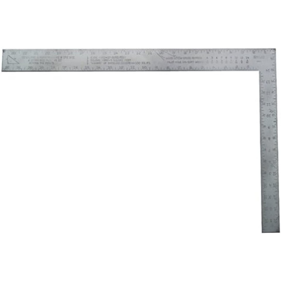 Product Description Carpenters Square, Aluminum, Buffed Finish, Body Size 24 x 2 In, Tongue Size 16 x 1 1/2 In, Graduations 1/8 In, Features Embossed Graduations, Number of Pieces 1 -- This Aluminum Carpenter's Square is a versatile tool providing a wide range of easy-to-read English measurement scales, tables, and conversions, including the new lumber scale, decimal equivalent table, and metric conversion table; formula for squaring a foundation; 45-degree, 60-degree, and 30-degree angle markings; volume and area formulas; wood screw gauge table; drill and nail sizes (common and finish); quantity per pound; and depth scale. This square is built with high tempered aluminum for maximum durability and comes with a buffed finish and protective lacquered coating to resist corrosion. The design features deep, embossed, long-wearing 1/8-inch graduations for long-term visibility; graduations and table information are on both sides of the square for added convenience. This carpenter's square has a body length of 24- by 2-inches and a tongue length of 16- by 1-1/2-inch and is backed by a lifetime limited warranty.