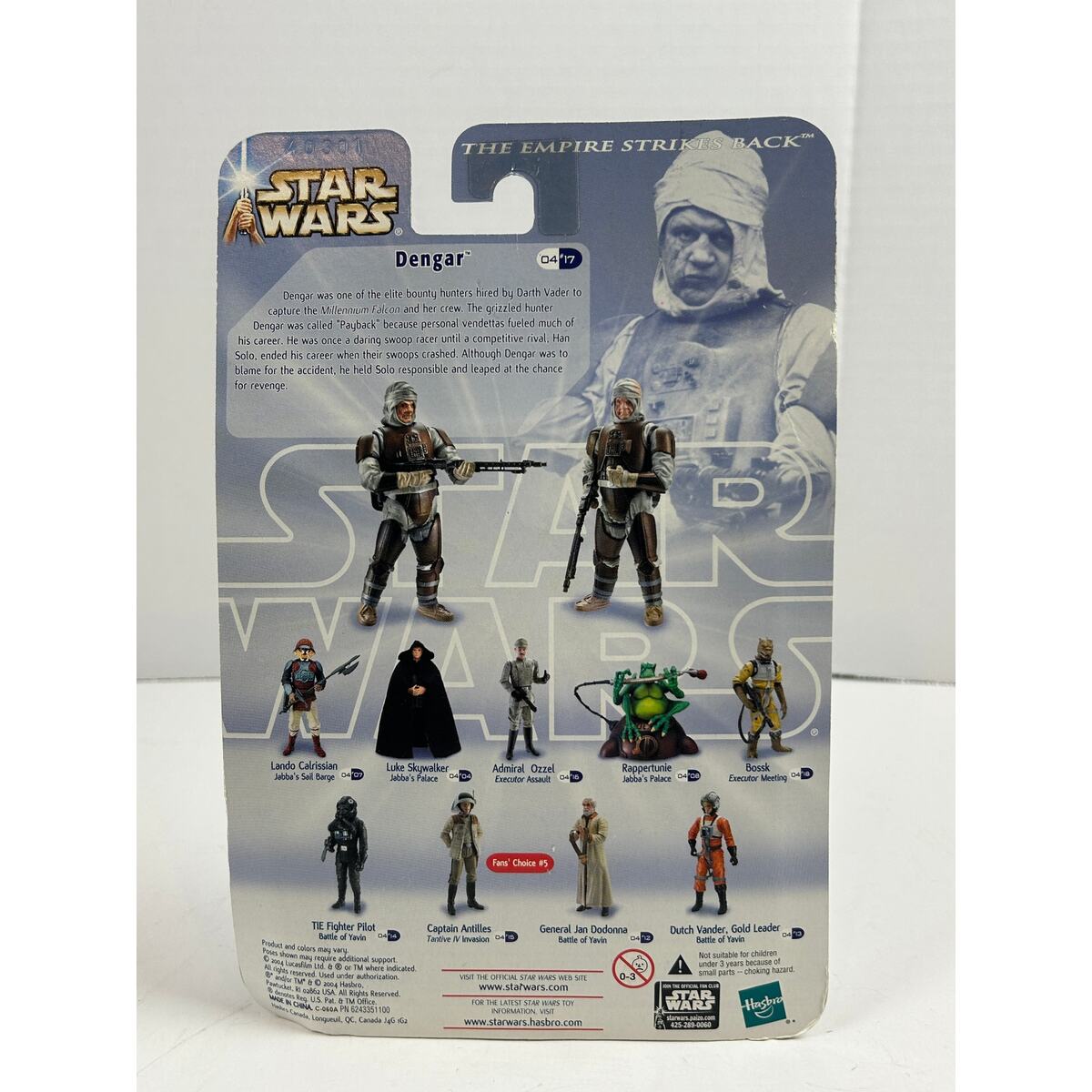 This is a factory sealed Dengar ?Executor Meeting? figure from Hasbro?s 2004 Star Wars Saga Collection (#17). The figure remains in original cardback packaging (MOC), includes backpack and gun. Card shows minor shelf wear and edge bumping; blister intact. Great for collectors looking for display quality.