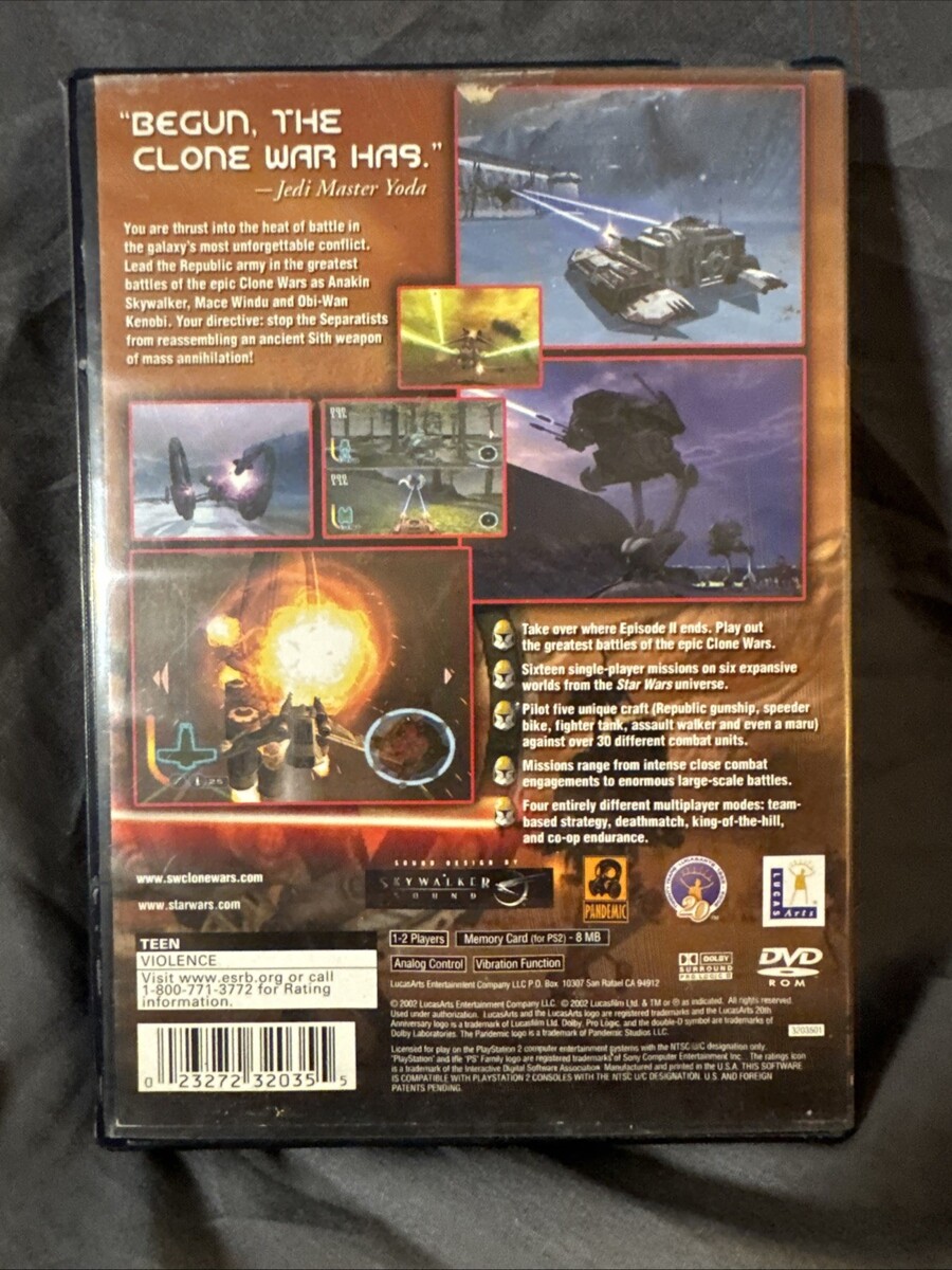 Star Wars: The Clone Wars for Sony PlayStation 2 is a video game published by LucasArts. Set in the War genre, the game is rated T-Teen and features characters and settings inspired by the popular Star Wars franchise. Players can immerse themselves in the action-packed world of the Clone Wars, engaging in battles and completing missions while experiencing the thrill of the epic conflict. With its iconic characters and immersive gameplay, Star Wars: The Clone Wars offers an exciting gaming experience for fans of both Star Wars and video games alike.