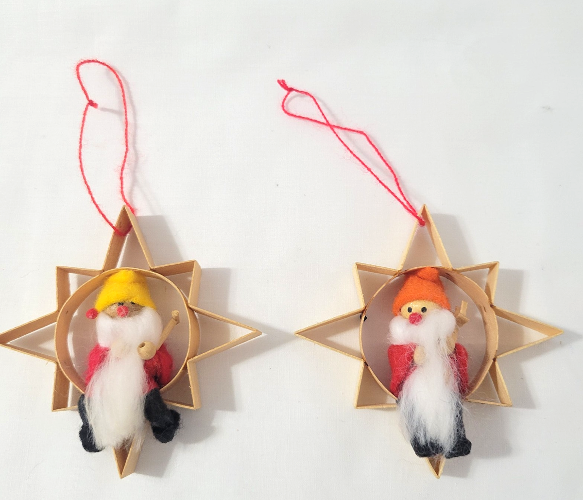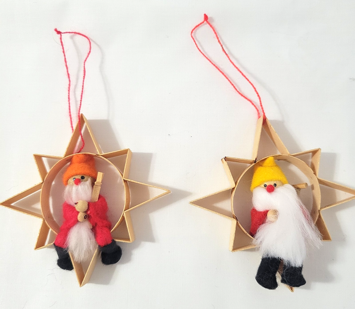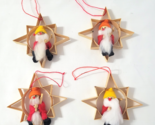 Great Lot of 4 harder-to-find ornaments -- each features a wood with felt elf sitting in a wood shaving 'star'-- all have red cords for hanging