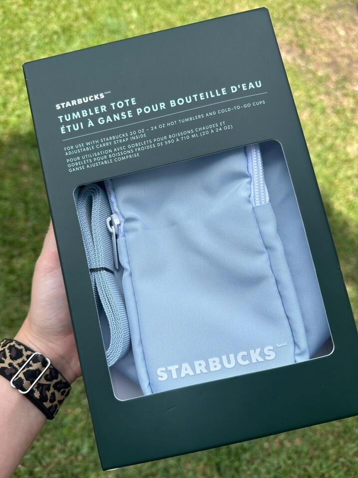 The Starbucks Spring 2025 Tumbler Tote Bag with Adjustable Strap in Powder Blue. New in original packaging. Bought from Starbucks store- I just never used it. For use with 20oz-24oz tumblers and cold to go cups. Adjustable strap included. Box has a couple of scuffs and blemishes, but it is how it was bought in store, and is brand new never opened. Please see photos.