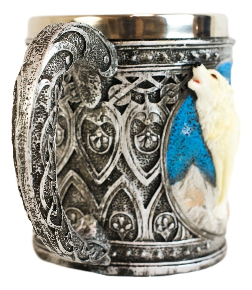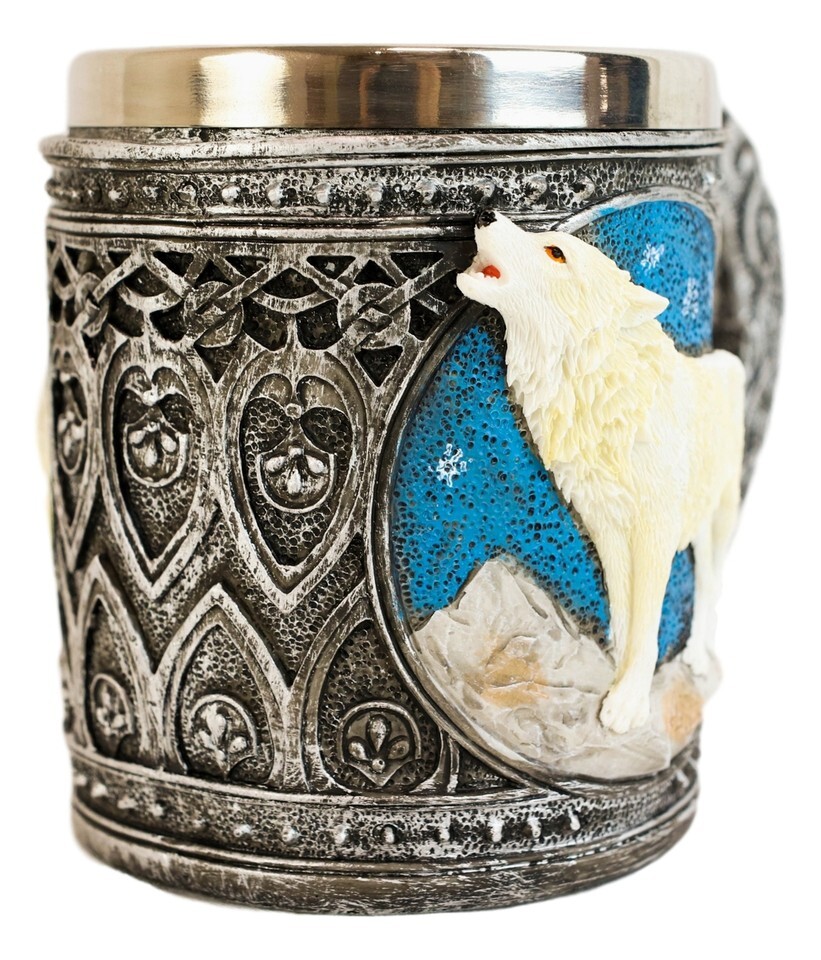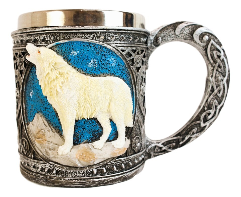? These Celtic White Dire-Wolf Drinkware is made of high quality resin, individually hand painted and polished. They are also designed with food safe stainless steel liner on the rim. Color Tone May vary from pictures. The resin body should be wiped with warm cloth to clean while the stainless steel liner can be washed with soap.