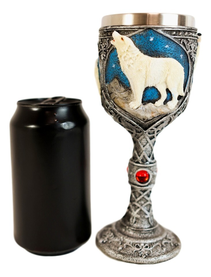 ? These Celtic White Dire-Wolf Wine Goblet measures 7.25" Tall 3.25" Wide And 3.25" Deep. It weighs about 12 ounces and has a 7 ounce fluid capacity.