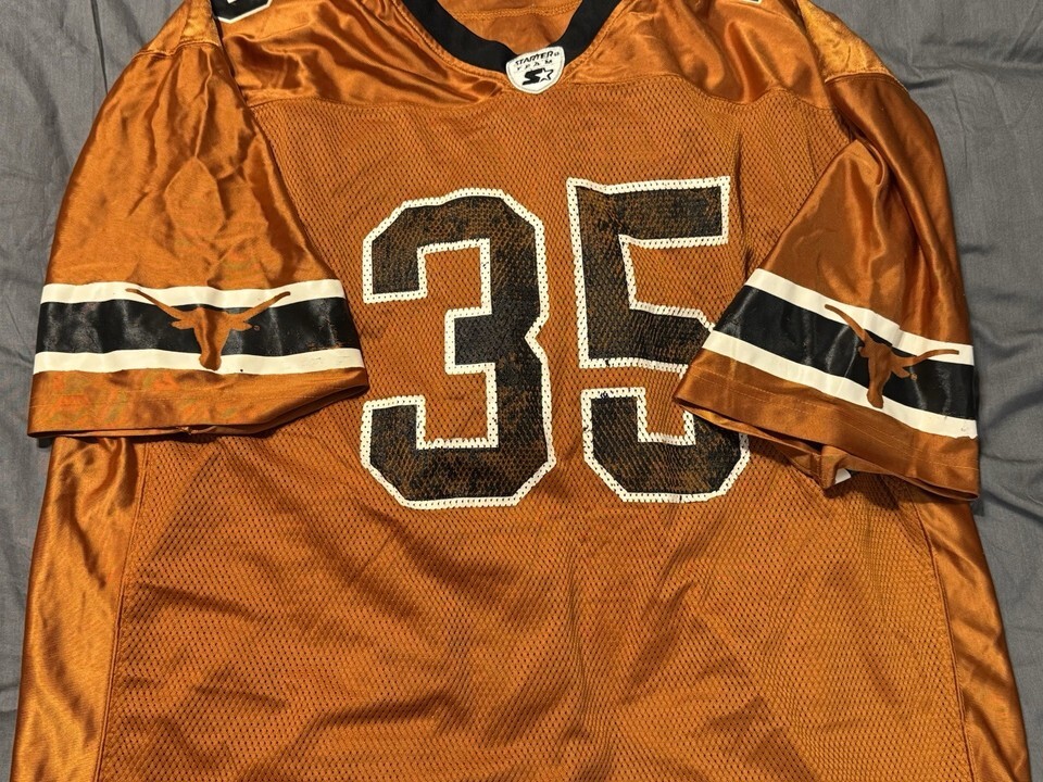 Classic Texas football vibes right here. This vintage Starter mesh jersey features the iconic burnt orange colorway, bold ?35? front and back, and Longhorns graphics on the sleeves. Lightweight, breathable, and full of that authentic aged-in wear collectors love.