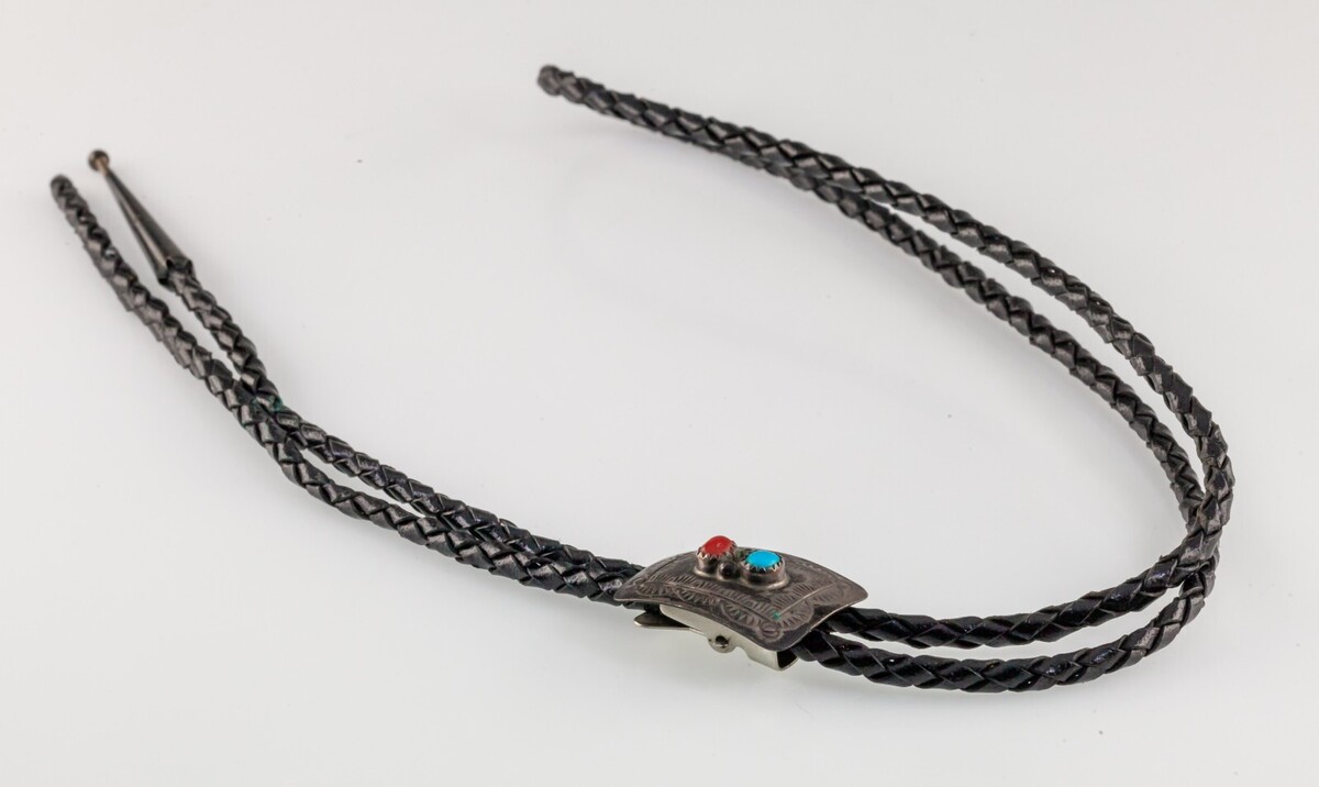 - Sterling Silber Türkis Und Koralle Geflochtenes Leder Bolo Tie