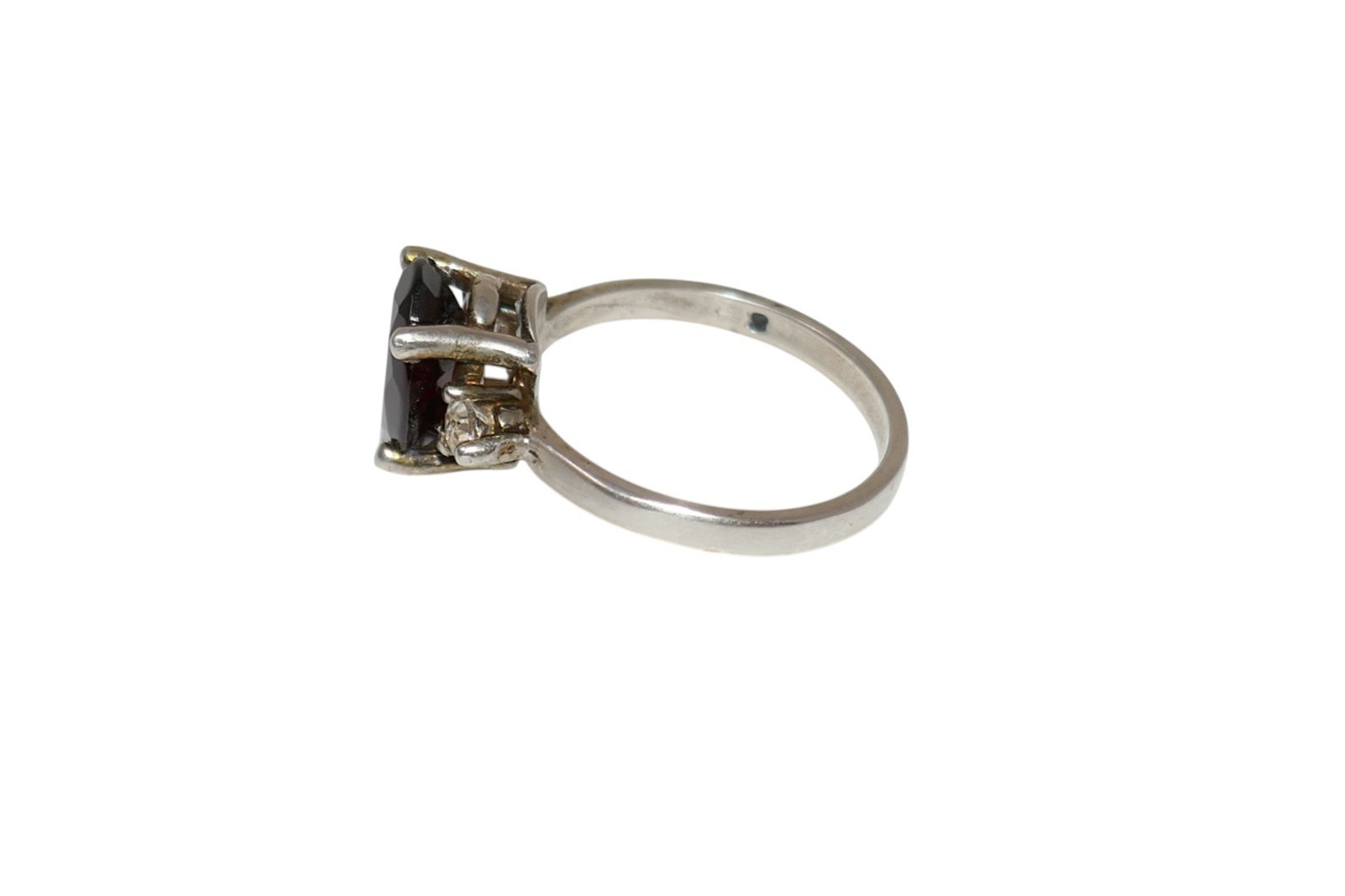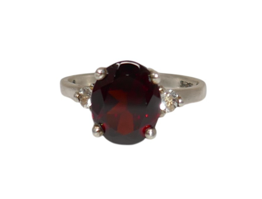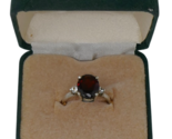 This Sterling Silver 925 Garnet and Diamond Accent Ring in size 7.5 features an oval-shaped 2.5 ct. Garnet as the main stone with two diamond accents. The ring weighs 3.5 grams with a 2.37mm thick band.
