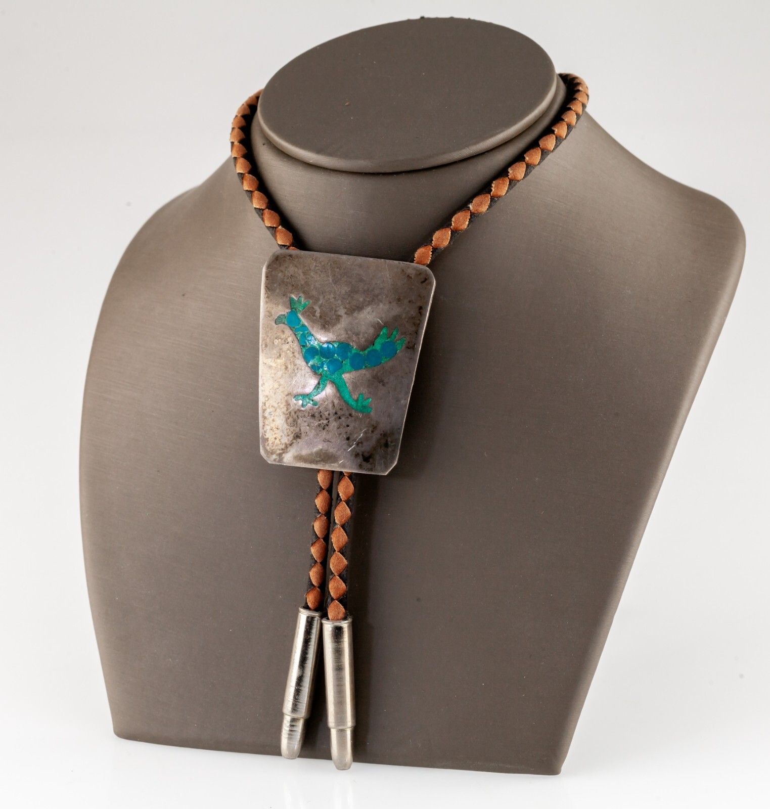 - Sterling Silver Bolo Tie with Turquoise Inlay Chicken Emblem and Braided Leather