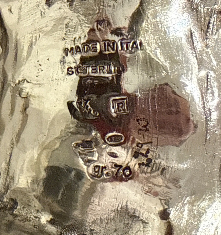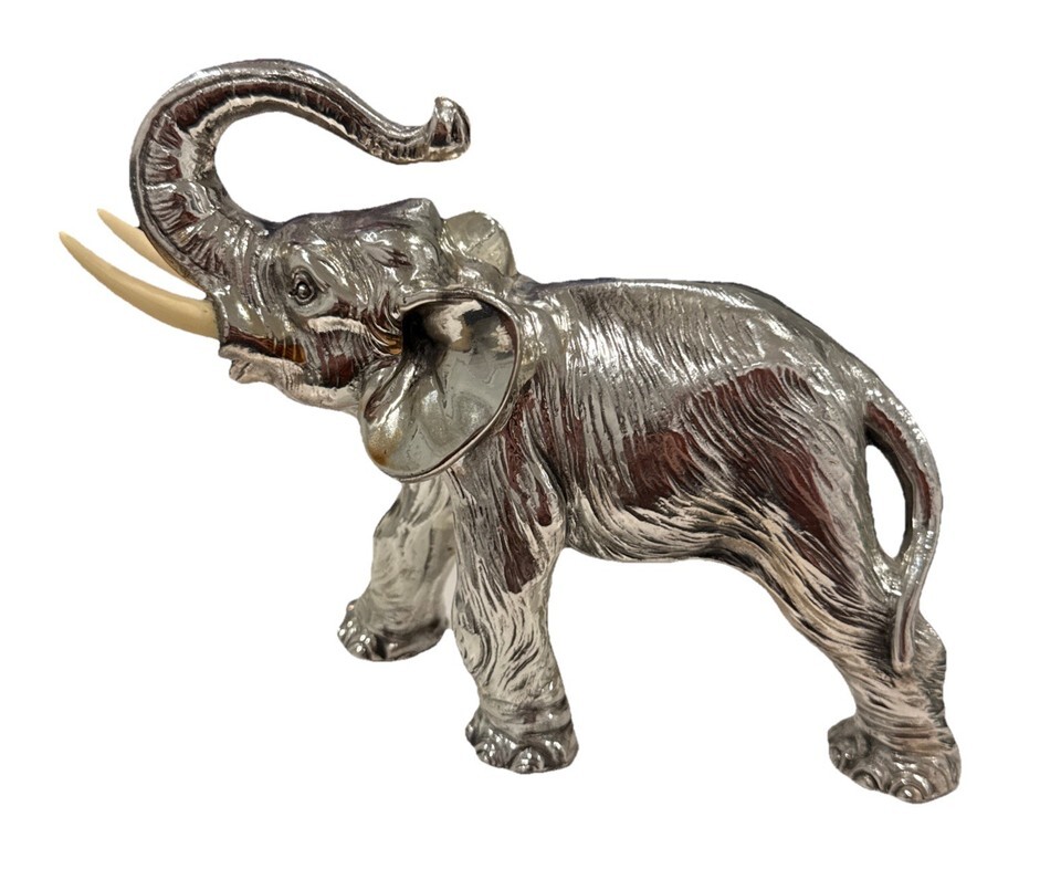 The product is a sterling silver elephant figurine made in Italy, featuring a mid-century modern style decor. The sculpture is made of 925 sterling silver. The total weight is 740 grams but based on its Riempito label, it contains a 70 gram silver shell. This unique piece showcases intricate details and craftsmanship, making it a valuable addition to any collection of antiques or silver miniatures.